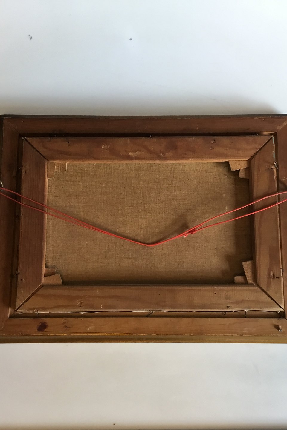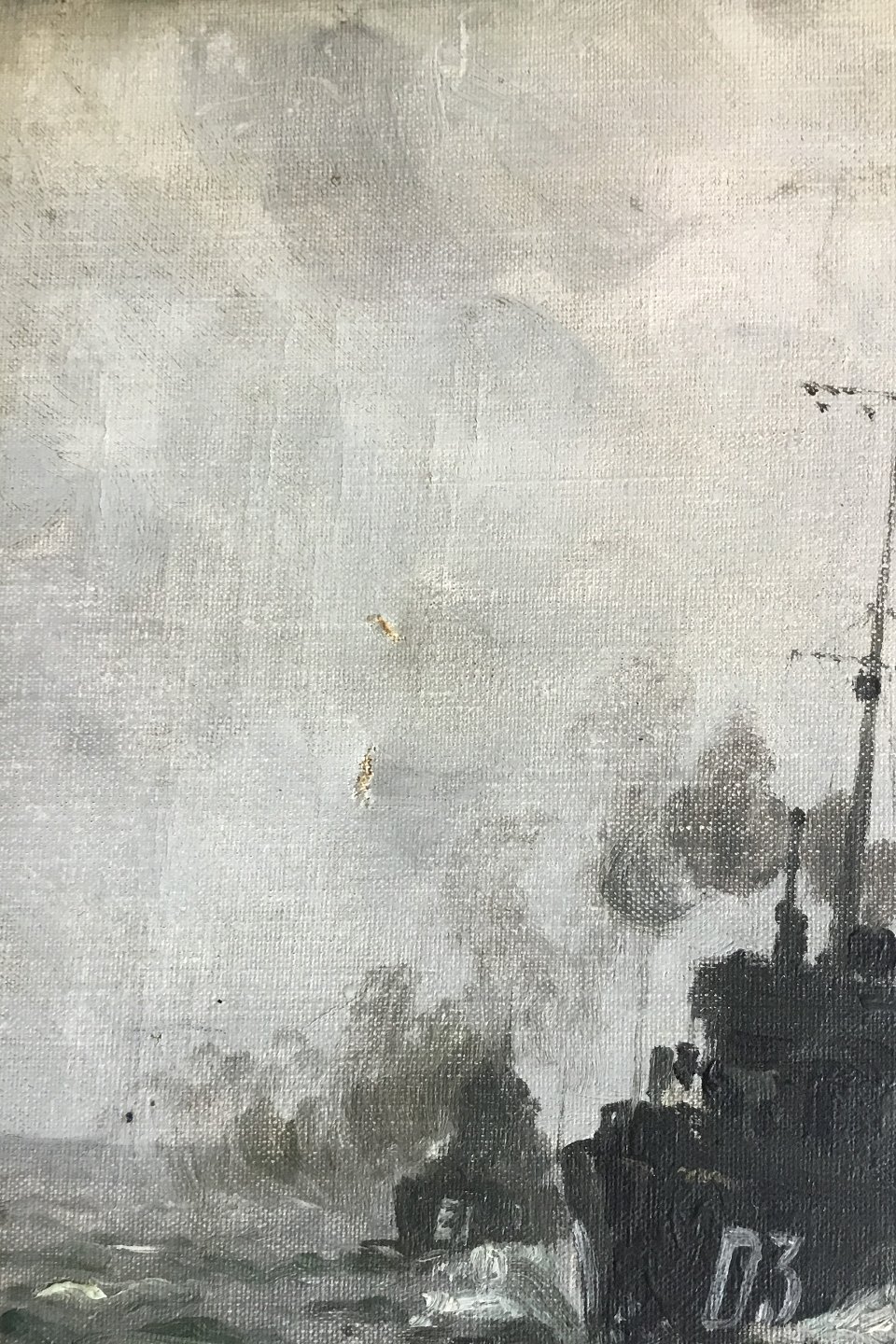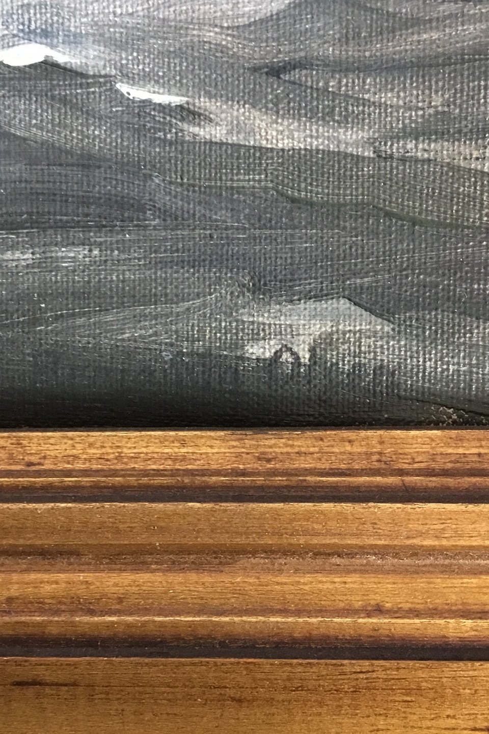 Oil on canvas Navy motif by Christian Benjamin Olsen. Measures 28 cm x 41 cm. Mounted in gold frame. Has two small starting holes