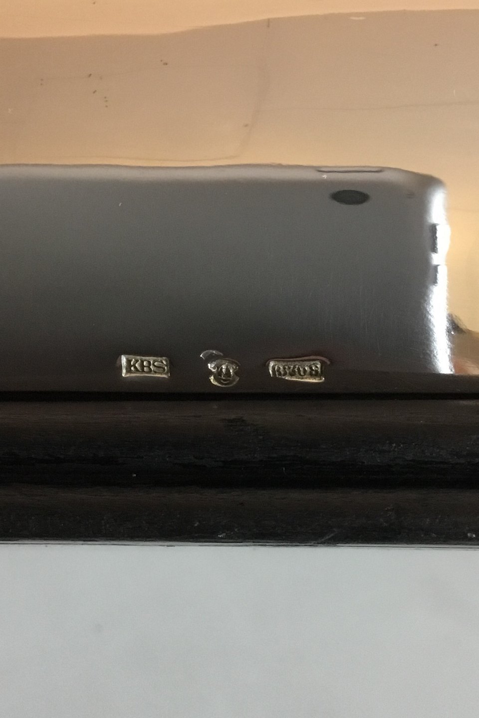 Kay Bojesen 830 S Silver box with bottom and inserts of partially black-painted mahogany. Measures 23.5 cm / 9 1/4 in. x 14.7 cm / 5 25/32 in. x 8.7 cm / 3 27/64 in. Weighs 849 grams / 29.95 oz.