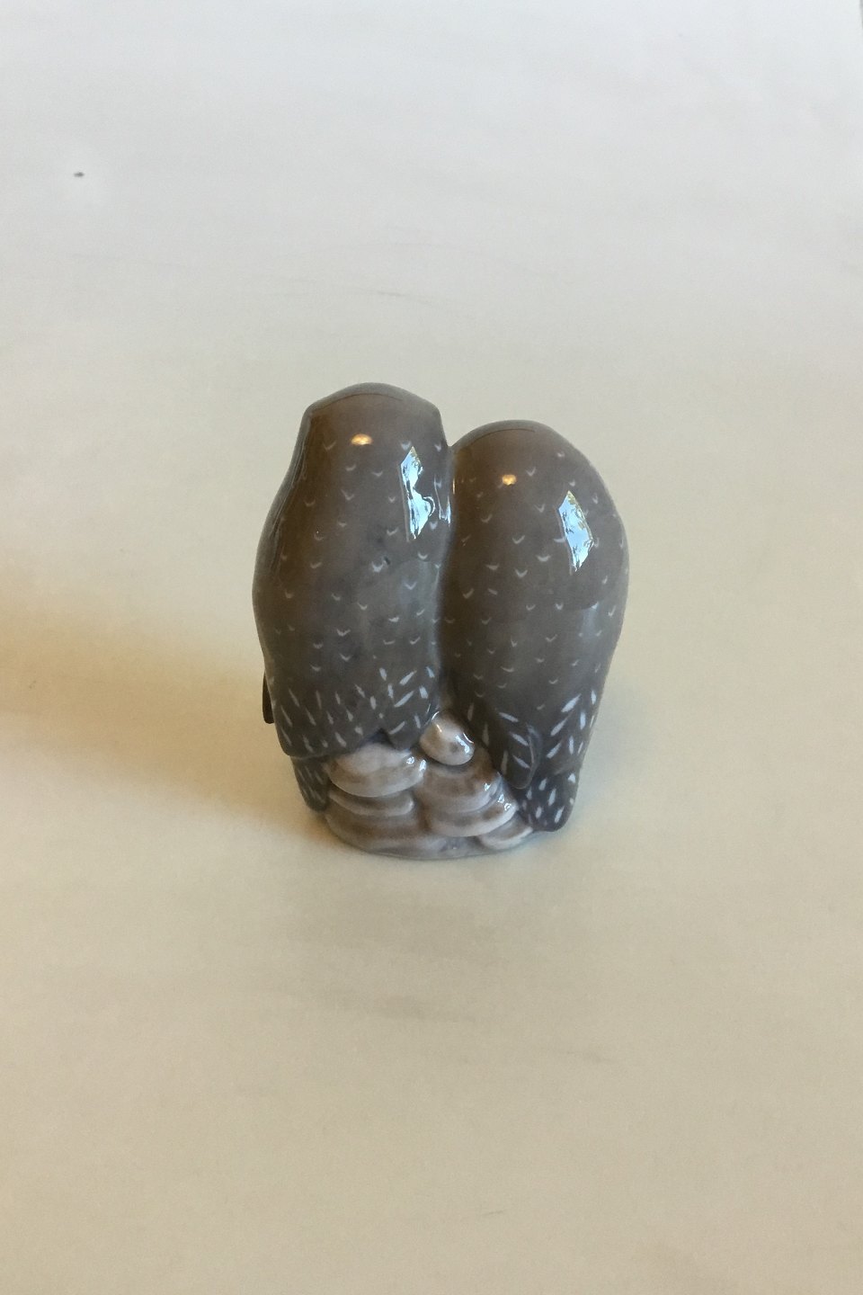 Royal Copenhagen Figurine of Pair of Owls No 1221/834. Measures 9 cm / 3 35/64 in. x 7 cm / 2 3/4 in. Designed by Th. Madsen