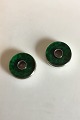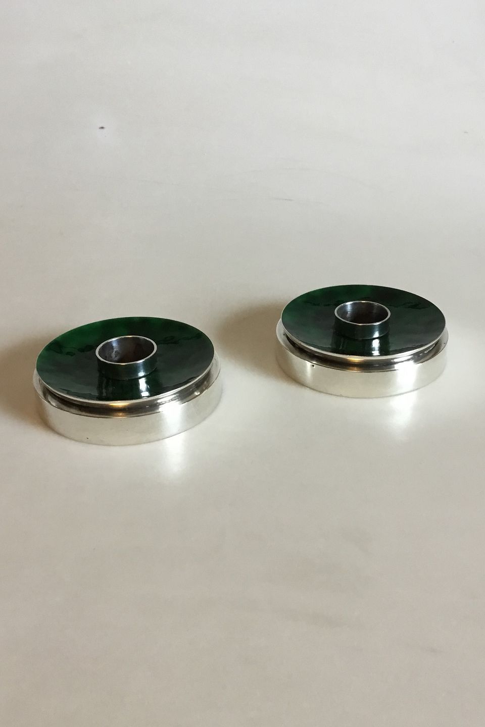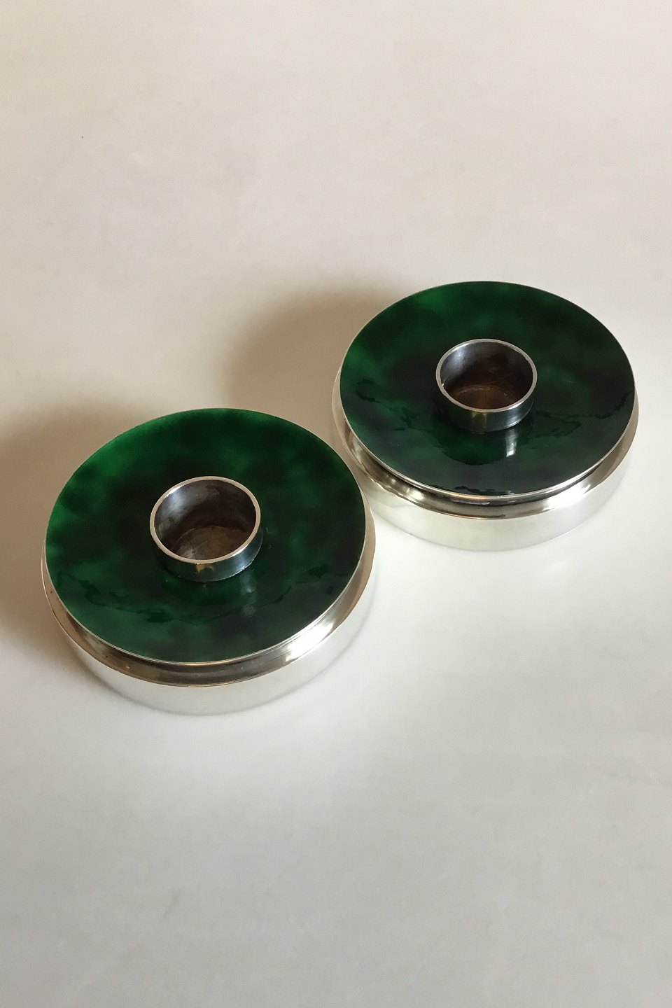 Evald Nielsen Sterlin Silver A Pair of Candleholders with green Enamel. Measures 2.2 cm 0 55/64 in. x 8.1 cm / 3 3/16 in. dia.