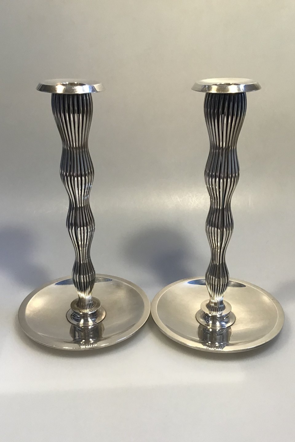F. Hingelberg Sterling Silver Candlesticks(2) designed by Svend Weihrauch. Stem made of curved silver rods H 29.5 cm(11 39/64 in) Combined weight 2094 gr/73.85 oz