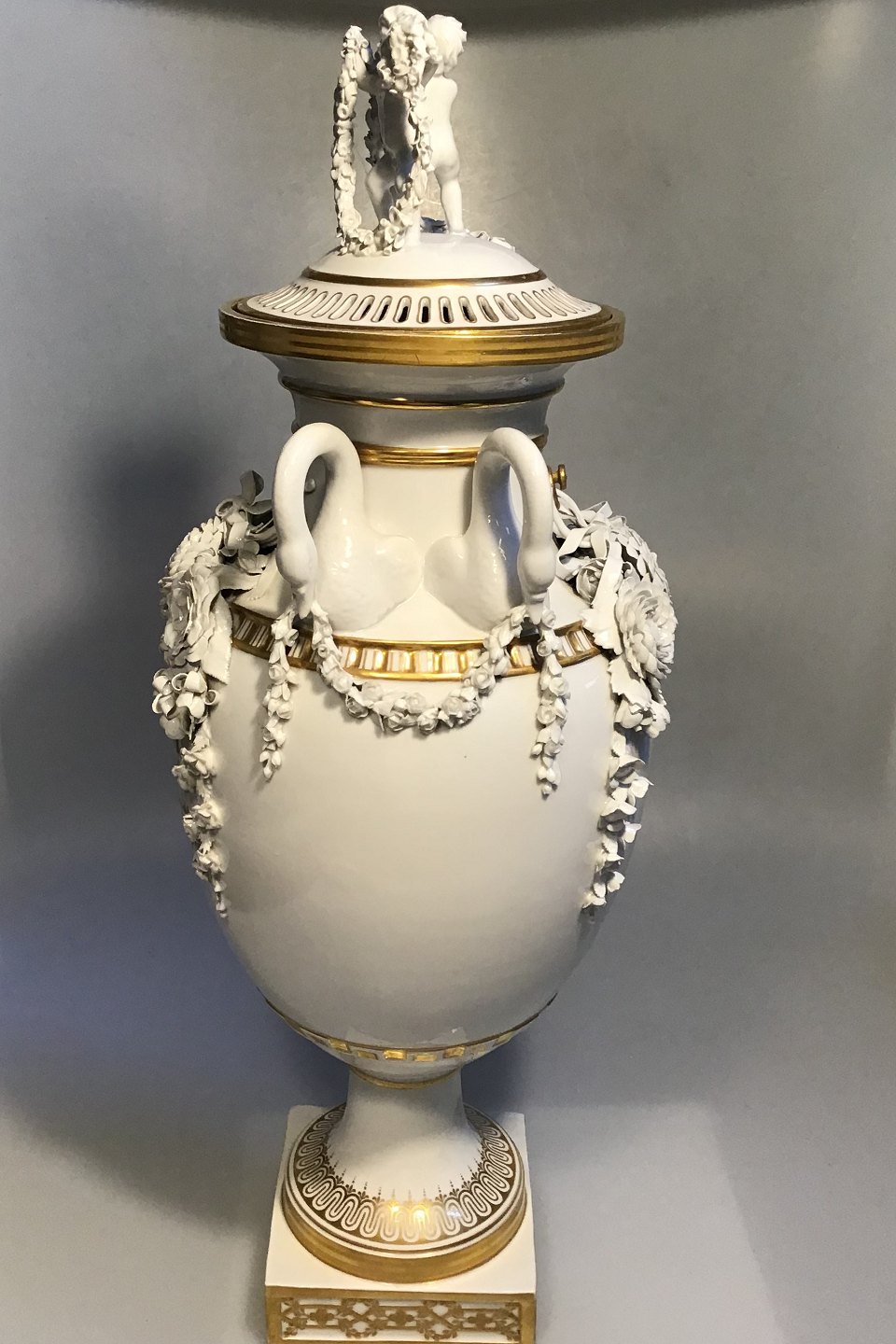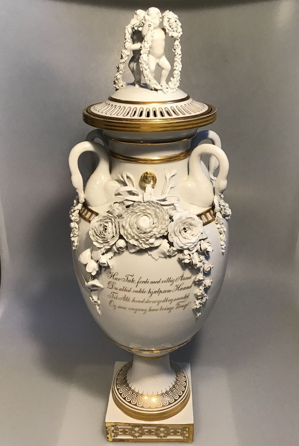 Royal Copenhagen ornamental Vase with Swans (1870-1890) 60 cm (23 5/8 in) Inscription on front(Dedication inside the lid)