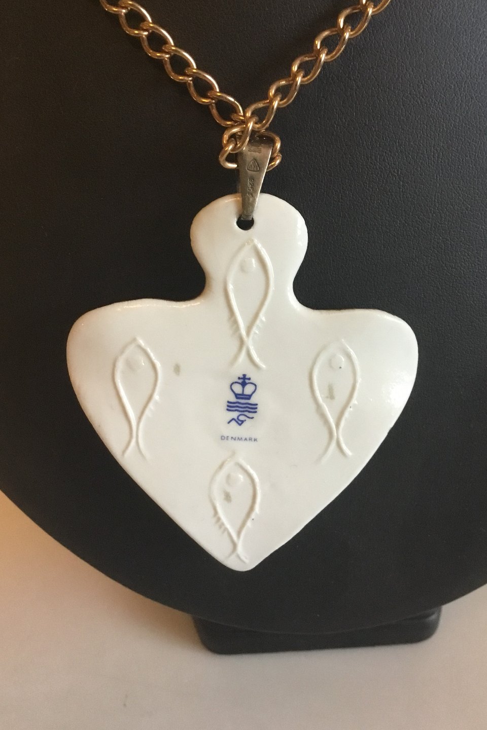 Royal Copenhagen Pendant of porcelain shaped and decorated as a Flounder. Designed by Nils Thorson. Sterling Silver by Anton Michelsen. Measures Pendant: 7 cm / 2 3/4 in. Chain: 60 cm / 23 5/8 in.