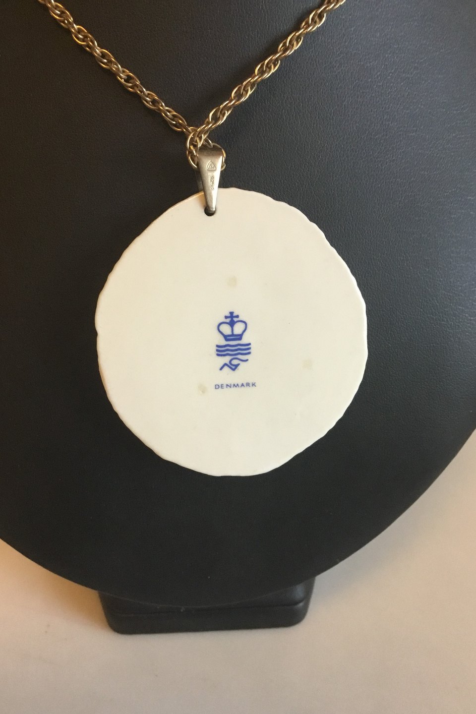 Royal Copenhagen Pendant of porcelain with golddecoration. Designed by Nils Thorson. Sterling Silver by Anton Michelsen. Measures 6.2 cm / 2 7/16 in. Chain: 60 cm / 23 5/8 in.