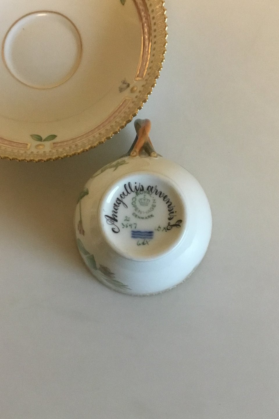 Royal Copenhagen Flora Danica Coffee Cup and Saucer No 20/3597. Latin Name: Sedum aizangulare Horn. Measures Cup: 7 cm / 2 3/4 in. x 7.5 cm / 2 61/64 in. dia. Saucer: 13.8 cm / 5 7/16 in.