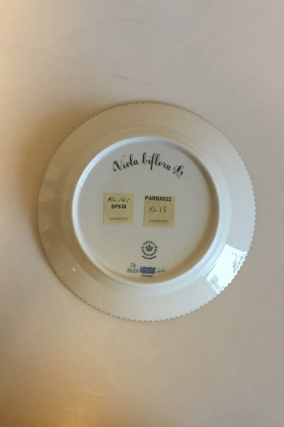Royal Copenhagen Flora Danica Salad Plate No 20/3573. Latin name: Viola biflora L. Measures 19.2 cm / 7 9/16 in.