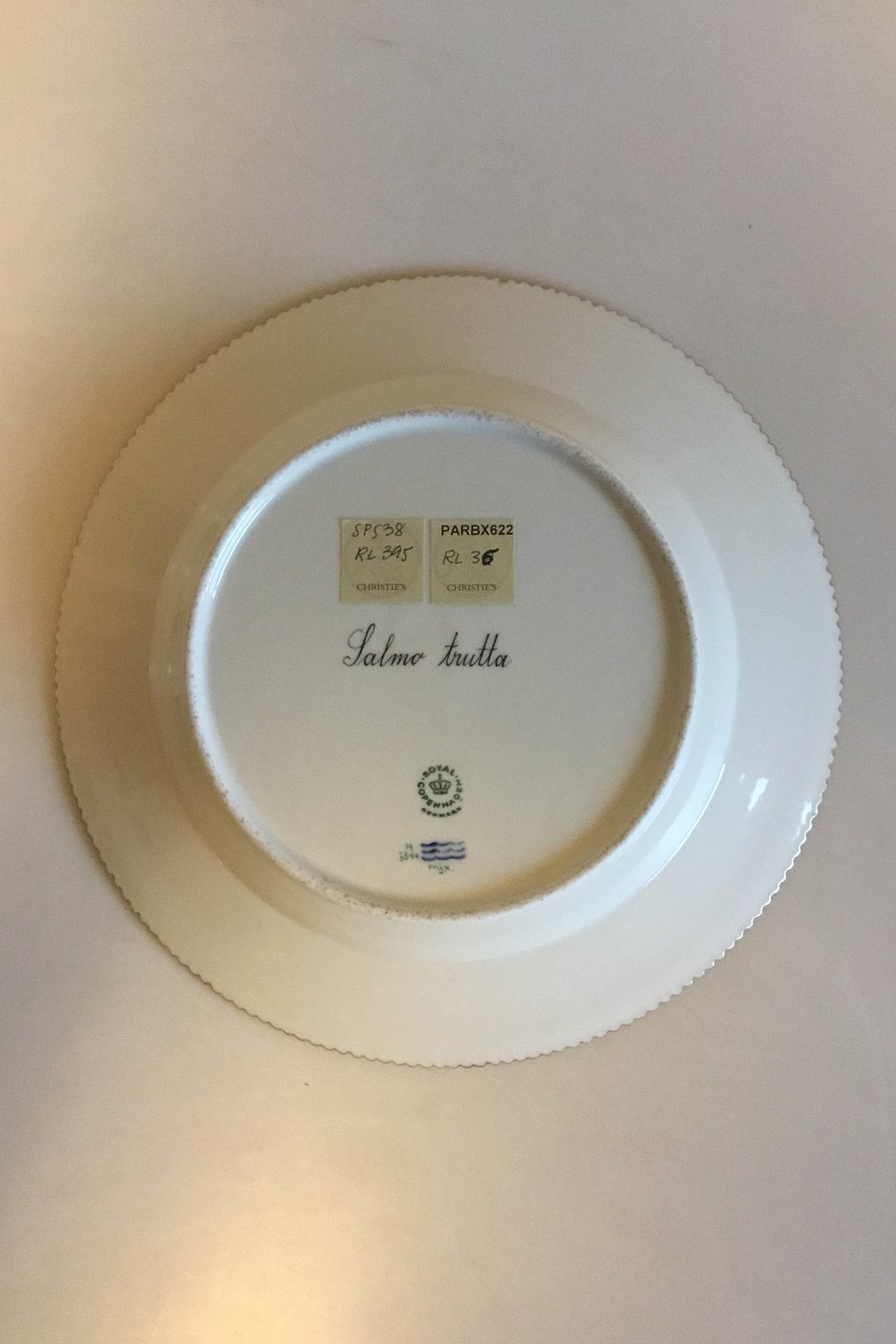 Royal Copenhagen Flora Danica Fish Plate No 20/3549. Latin name: Salmo trutta. Measures 25.8 cm / 10 5/32 in. Chips