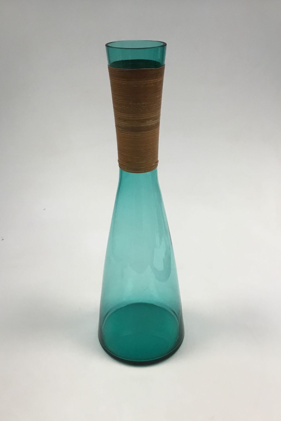 Kastrup Glassworks Opaline shape Green decanter with bamboo wrapping. Jacob E. Bang 1957. Measures 40 cm / 15 3/4 in.