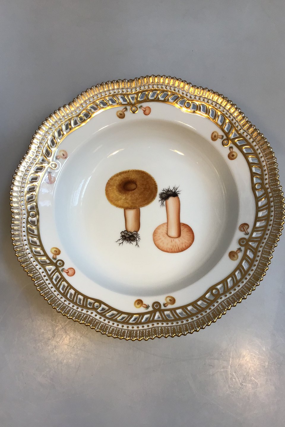 Royal Copenhagen Flora Danica Deep Plate with pierced border No 634 (20/3547) Latin Names Agaricus scaber Müll, Lycoperdon gemmatum Batsch, Agaricus glutinosus Vahl, Agaricus nitens Vahl, Agaricus semistriatus Vahl, Agaricus torminosus Schäff. All fungi motifs