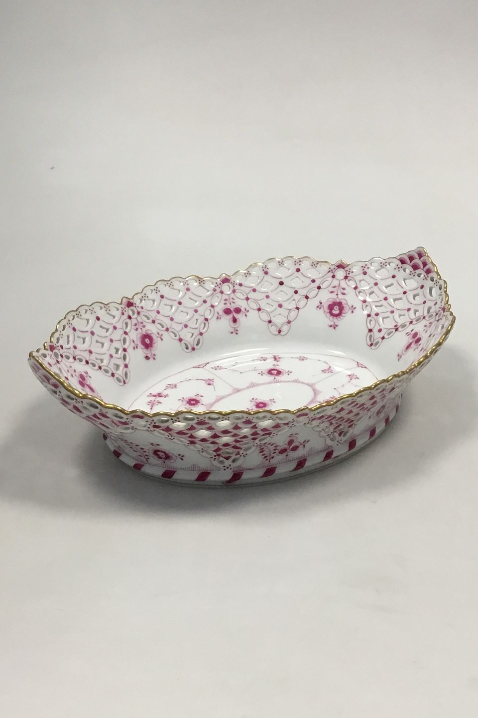 Royal Copenhagen Blue Fluted Red Ruby/Pink with Gold Edge Full lace Bread Basket. Measures 30 cm