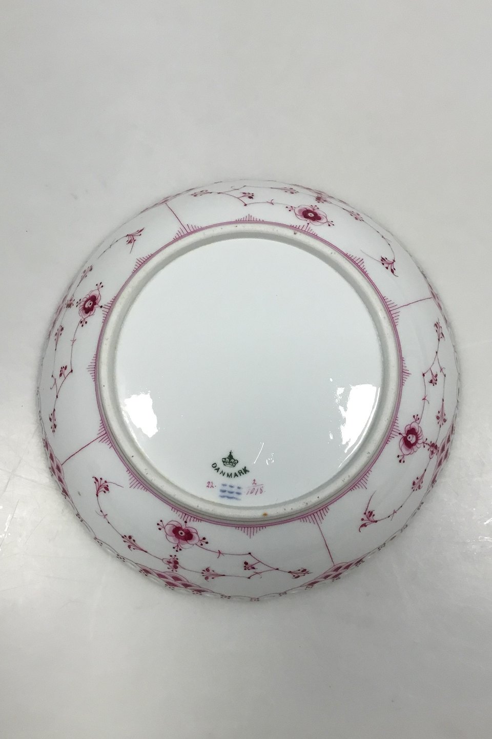 Royal Copenhagen Blue Fluted Red Ruby/Pink with Gold Edge Full Lace Low Bowl No 2/1018. Measures 5.3 cm / 2 3/32 in. x 20.5 cm / 8 5/64 in.
