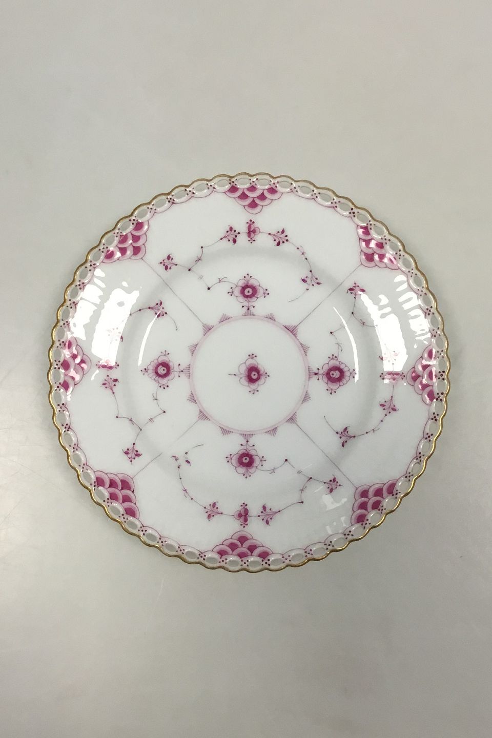 Royal Copenhagen Blue Fluted Red Ruby/Pink with Gold Edge Full Lace Cake Plate No 2/1088. Measures 14.5 cm / 5 45/64 in.