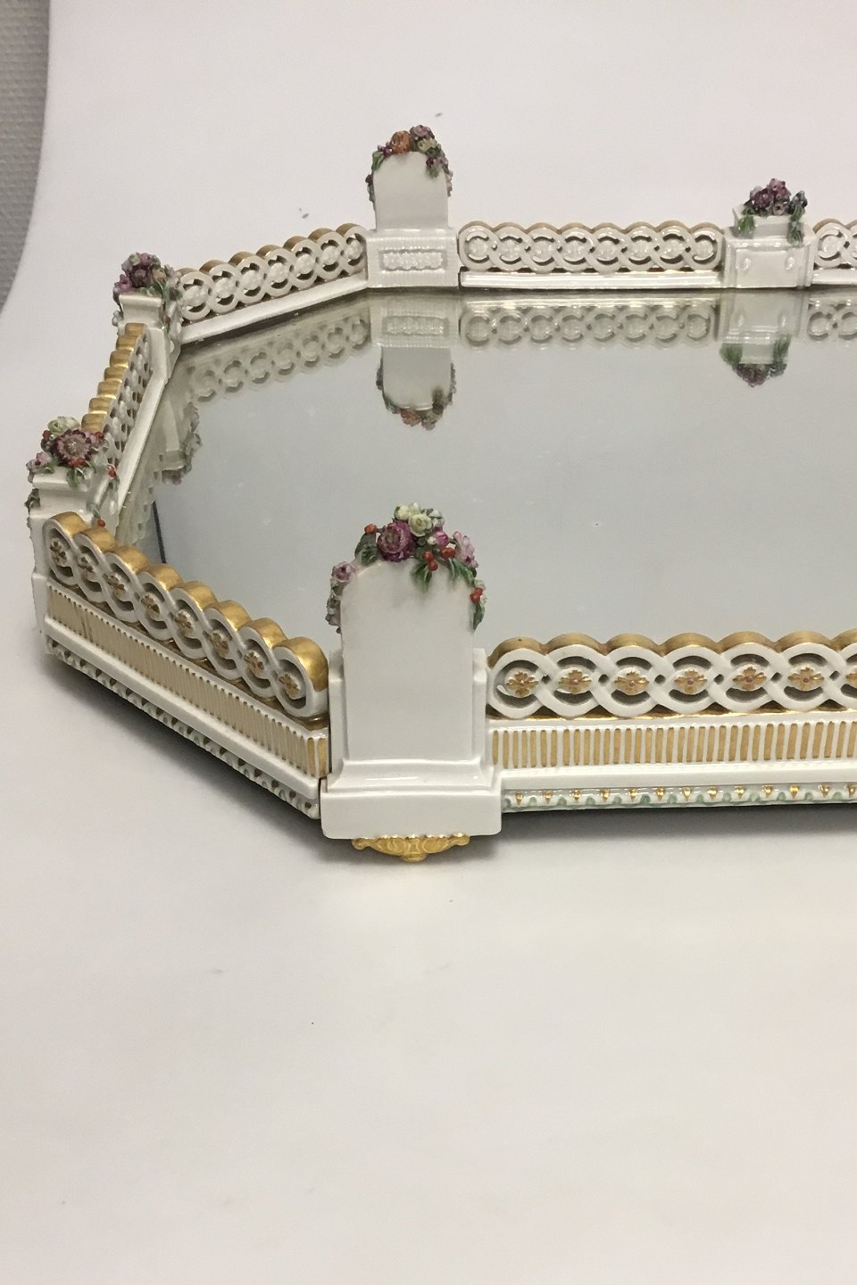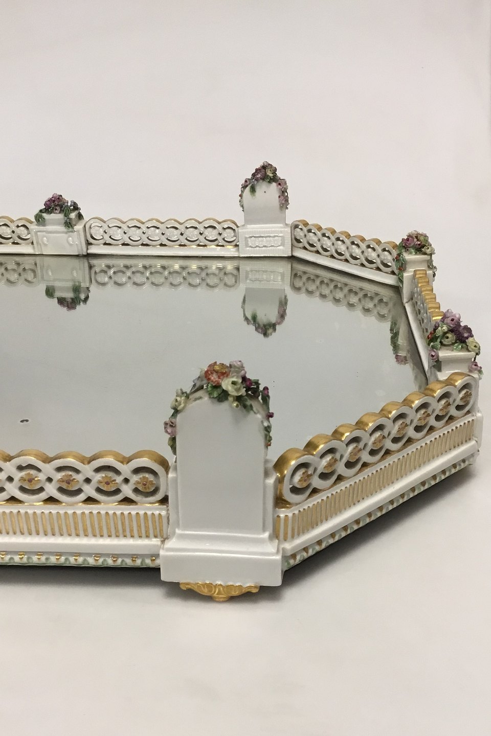 Large Royal Copenhagen Decoration tray with mirror/table garniture. Mirror with discoloration and a few small chips on flowers. Measures 37 cm / 14 9/16 in. x 52 cm / 20 15/32 in.