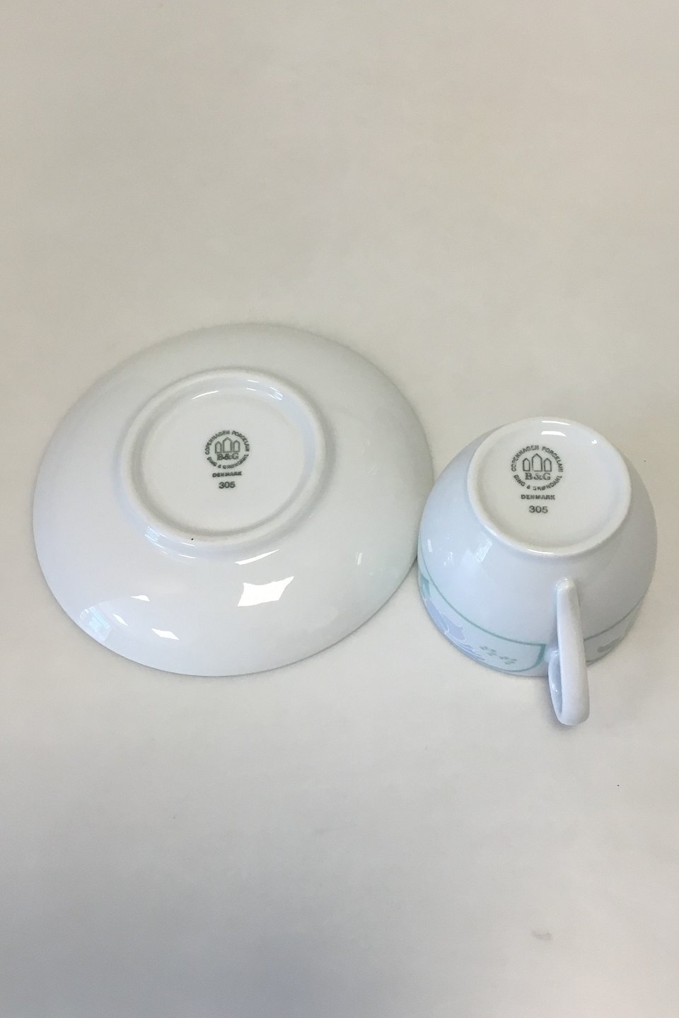 Bing & Grondahl Fleur, Light Blue Coffee Cup and Saucer. Measures Cup: 5.8 cm / 2 9/32 in. x 7 cm / 2 3/4 in. dia. Saucer: 13.7 cm / 5 25/64 in.