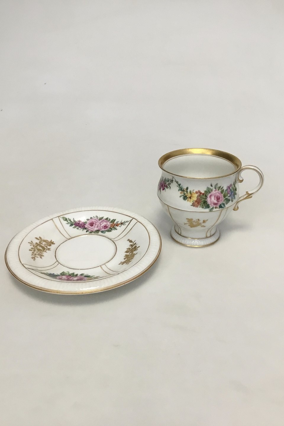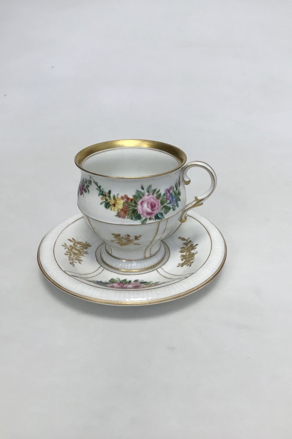 Bing & Grøndahl Cup and Saucer in gilt and Polychrome over glaze with floral motive. Under side both marked with blue B & G mark. H: 8,5 cm (3 11/32")