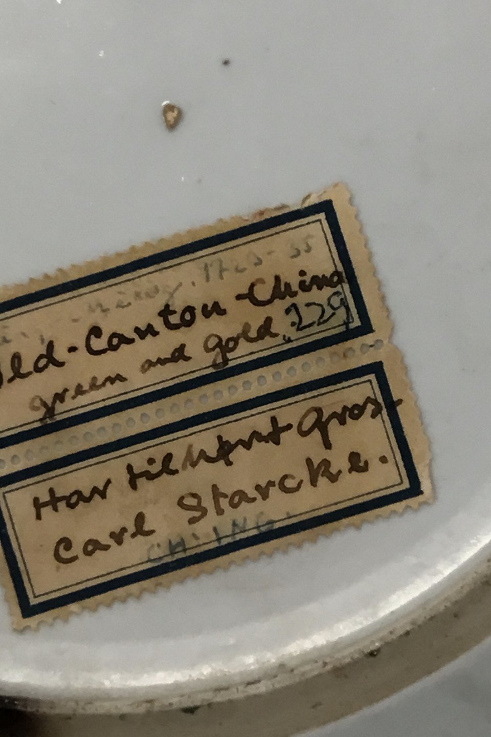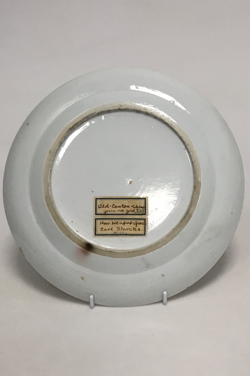 Chinese Canton (gold and green) plate. Palace scenery, birds and butterflies. Ca. 1850. Small hairline and bursted glaze bubble, see pictures. Dia: 24 cm (9 29/64").