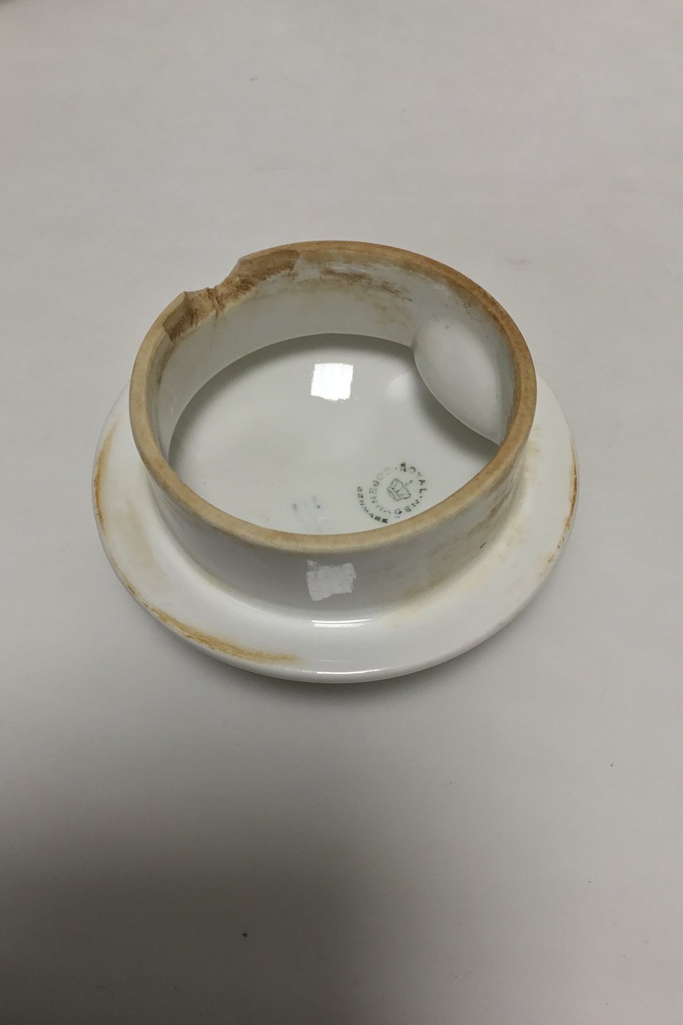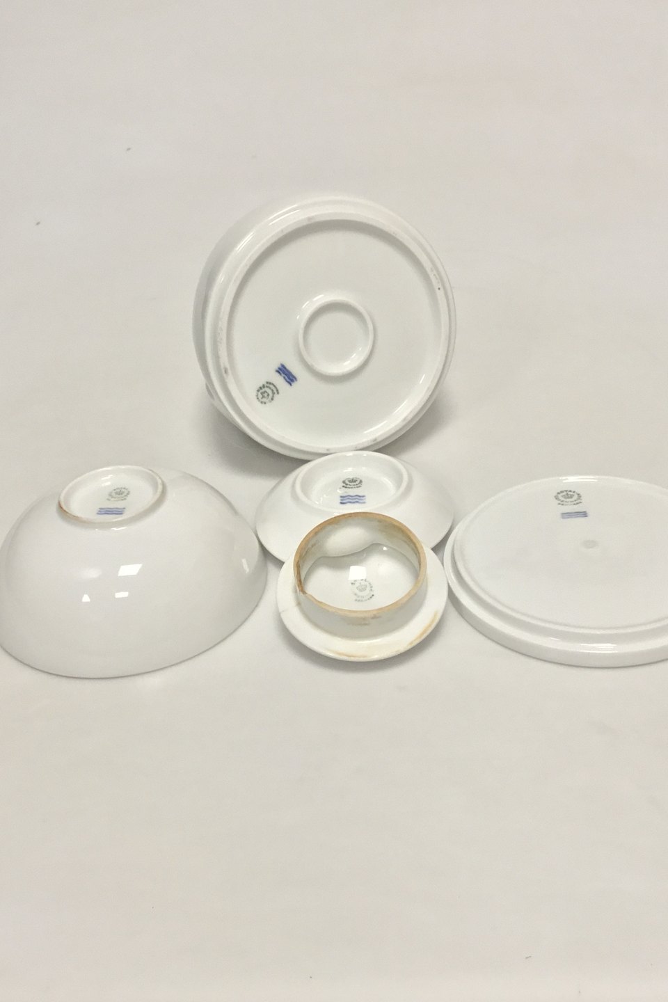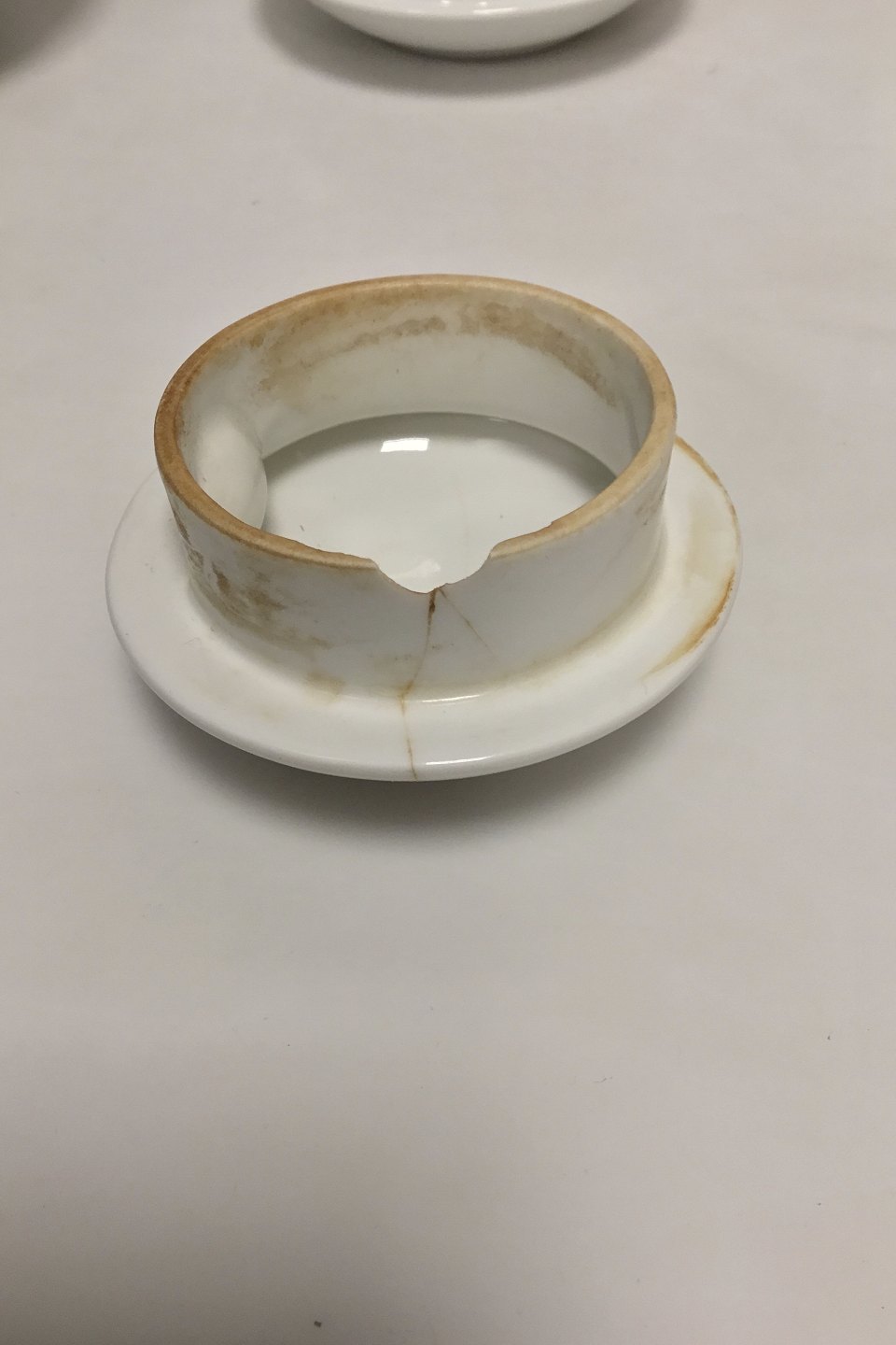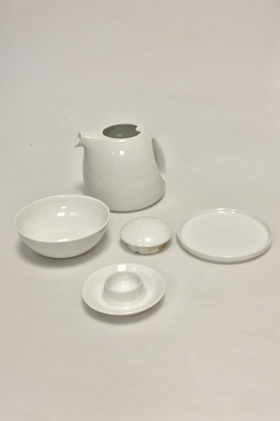 Royal Copenhagen white porcelain Coffee Pot with lid, small tray, egg cup and bowl, all in one. Lid with damages, please see pictures. H: 20 cm (7 7/8")