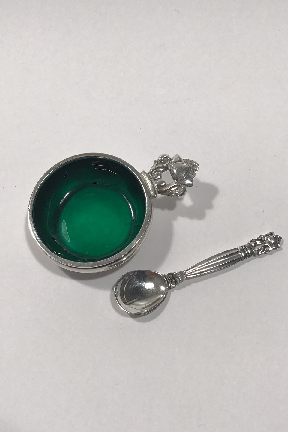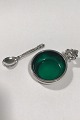 Georg Jensen Sterling Silver Acorn Saltcellar No 62 (Green enamel) and Salt Spoon Measures 4.1 cm(1 39/64 in) Spoon 6 cm(2 23/64 in)