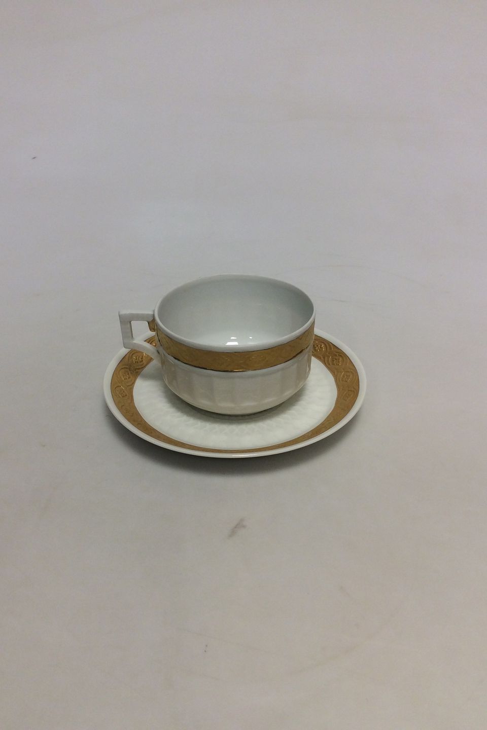 Royal Copenhagen Gold Fan Tea Cup and Saucer No. 11545. 5 cm H. 8 cm diameter.