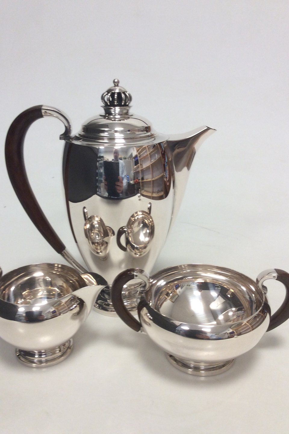 Theodor Sabroe Art Deco Danish Silver Coffee Set with Pot, creamer and sugar bowl from 1942.