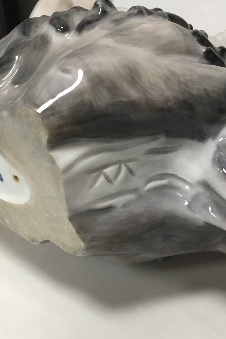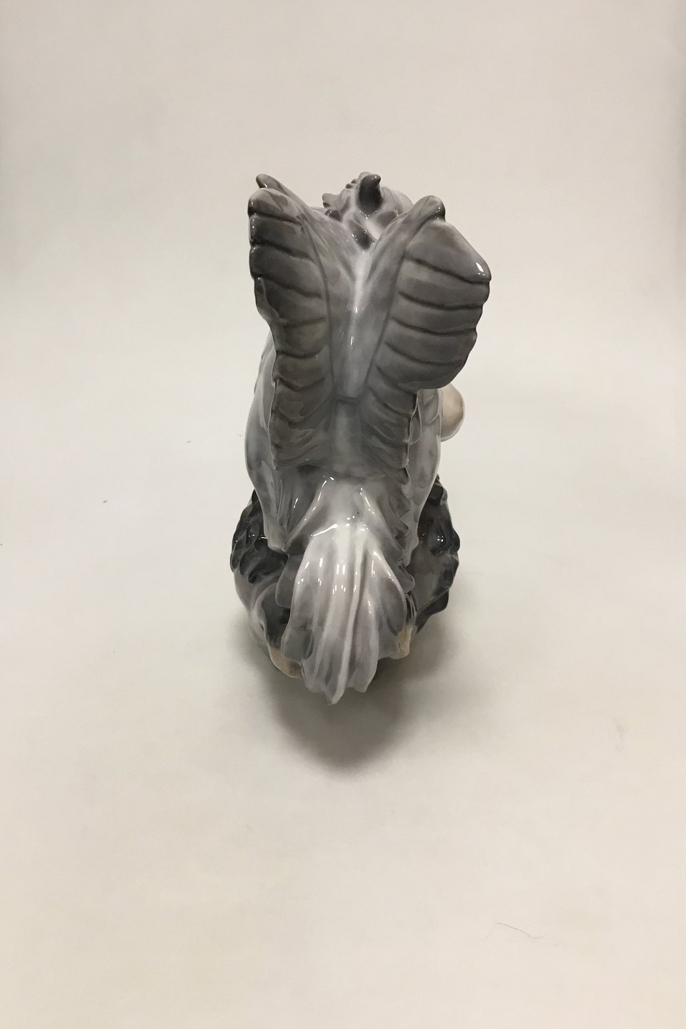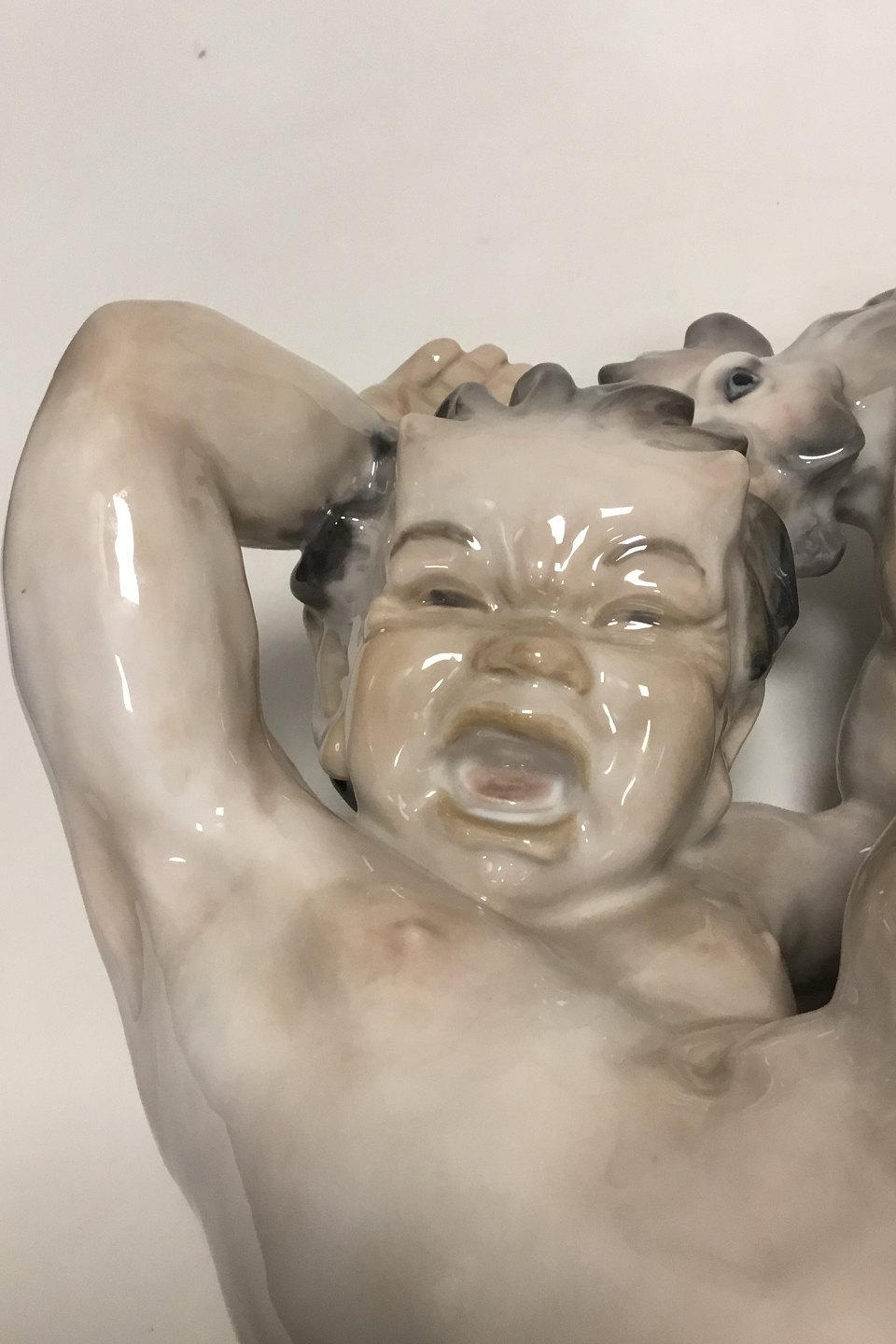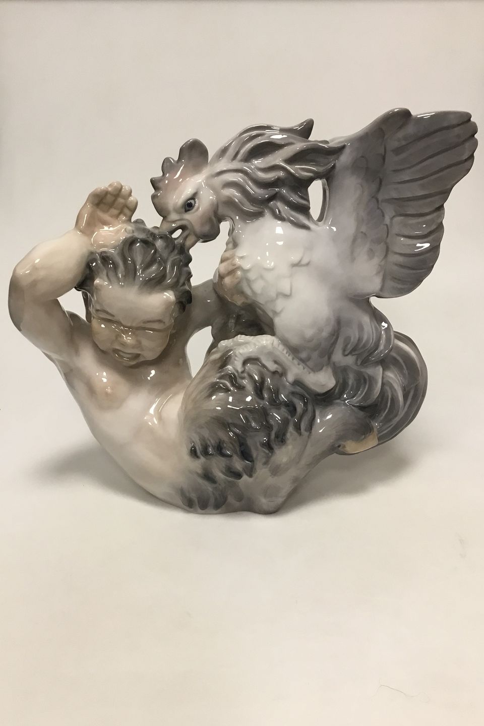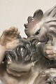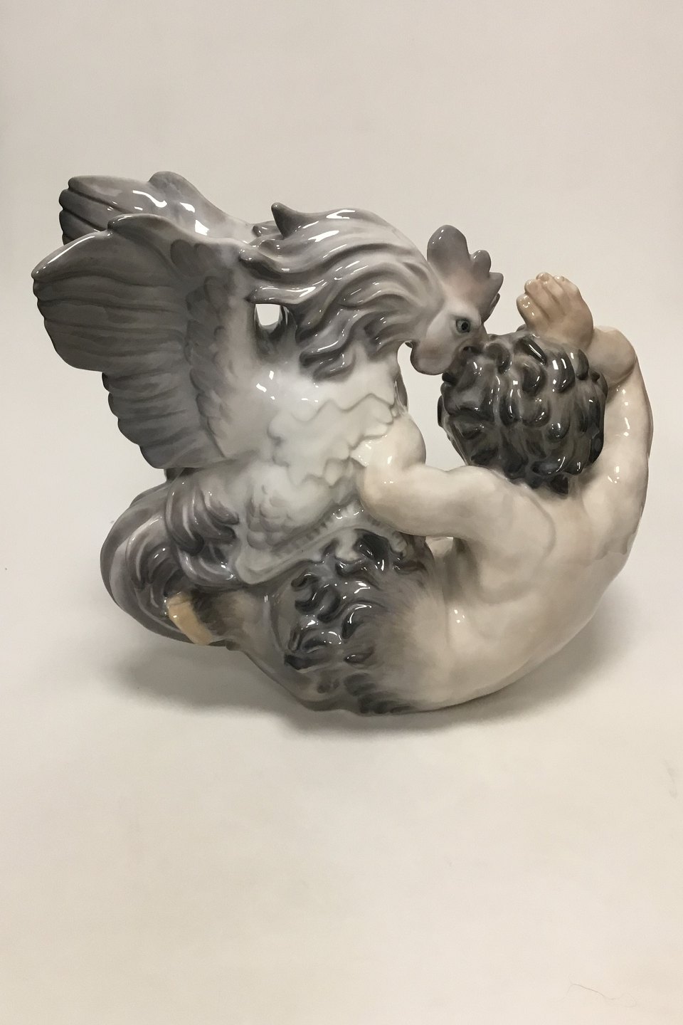 Royal Copenhagen Figurine og Faun in a fight with a Rooster No 3083. Signed KK for Knud Kyhn. Measures 30 cm / 11 13/16 in. x 32 cm / 12 19/32 in. 1st Quality and in a very nice condition.