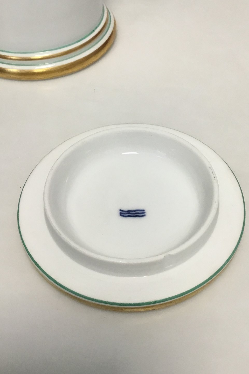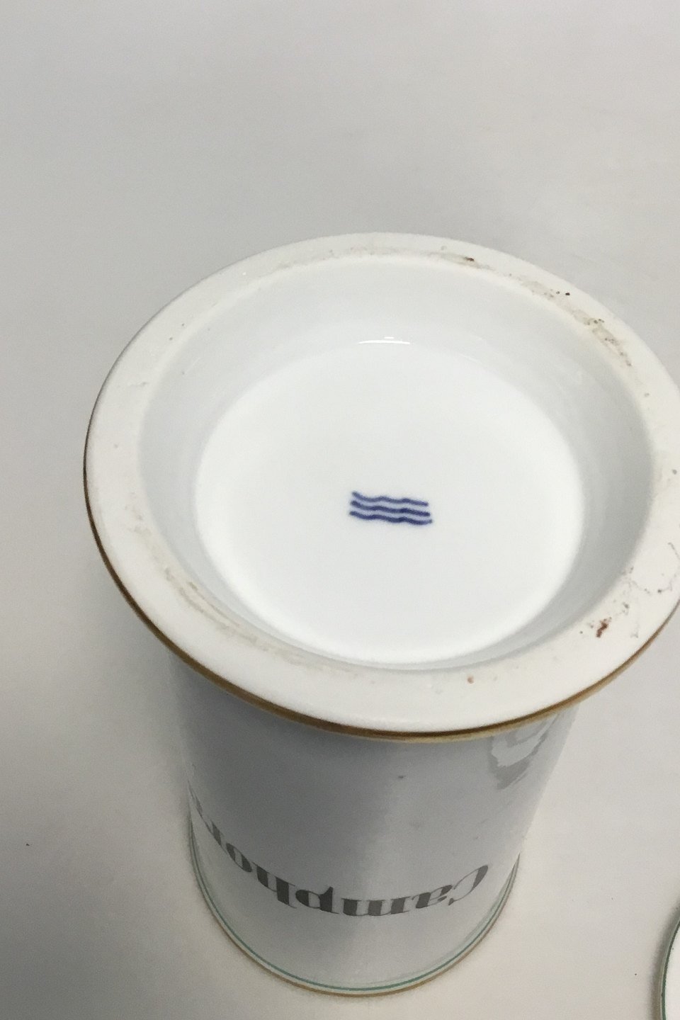 Royal Copenhagen Pharmacy Jar. Text "Camphora". Measures 21.5 cm / 8 15/32 in. Small chip on the inside of Lid