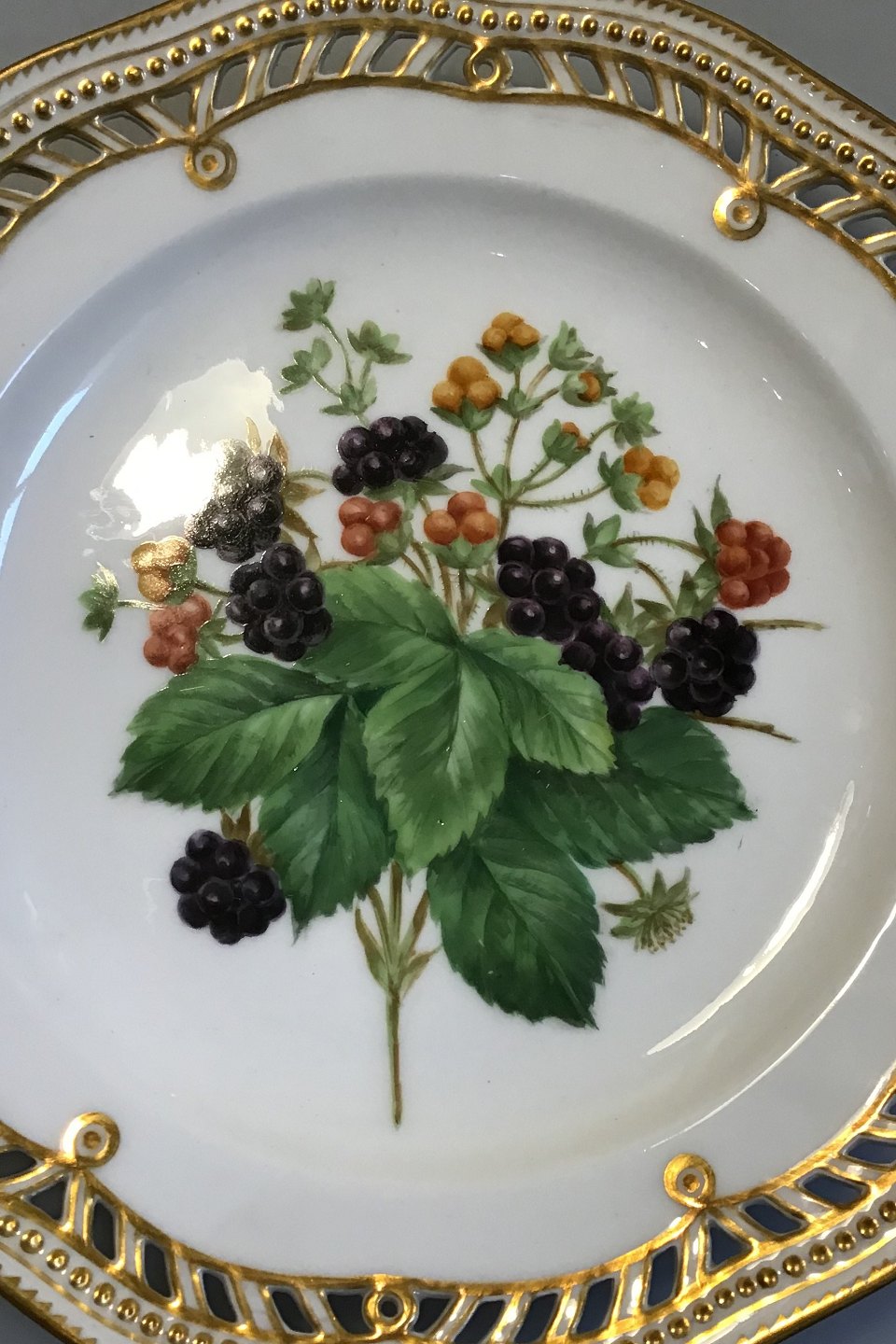Royal Copenhagen Flora Danica Fruit Plate No 429/3584. Measures 22.2 cm / 8 47/64 in. 1st Quality. Pierced Border.