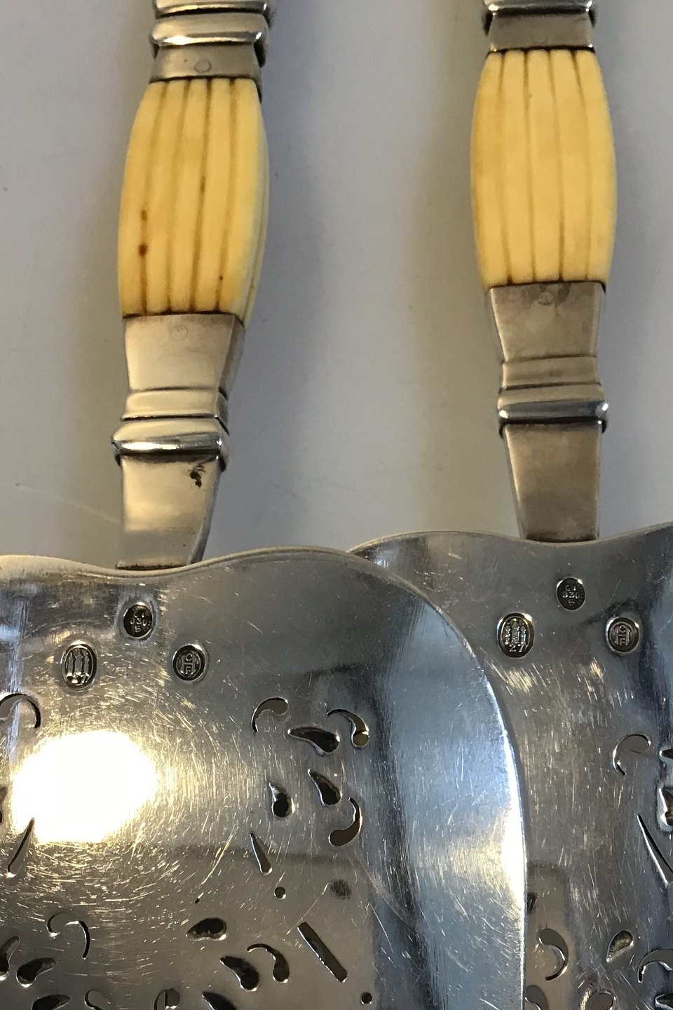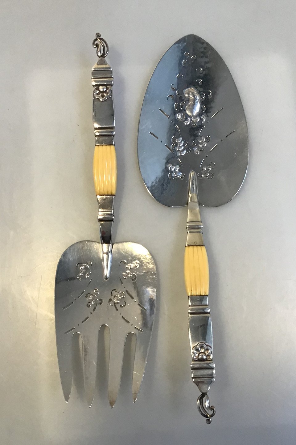 Georg Jensen Silver Fish Serving Set (1927) Partly bone handle Floral decoration Measures Server 27.5 cm(10 53/64 in) Fork 26 cm(10 15/64 in)