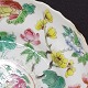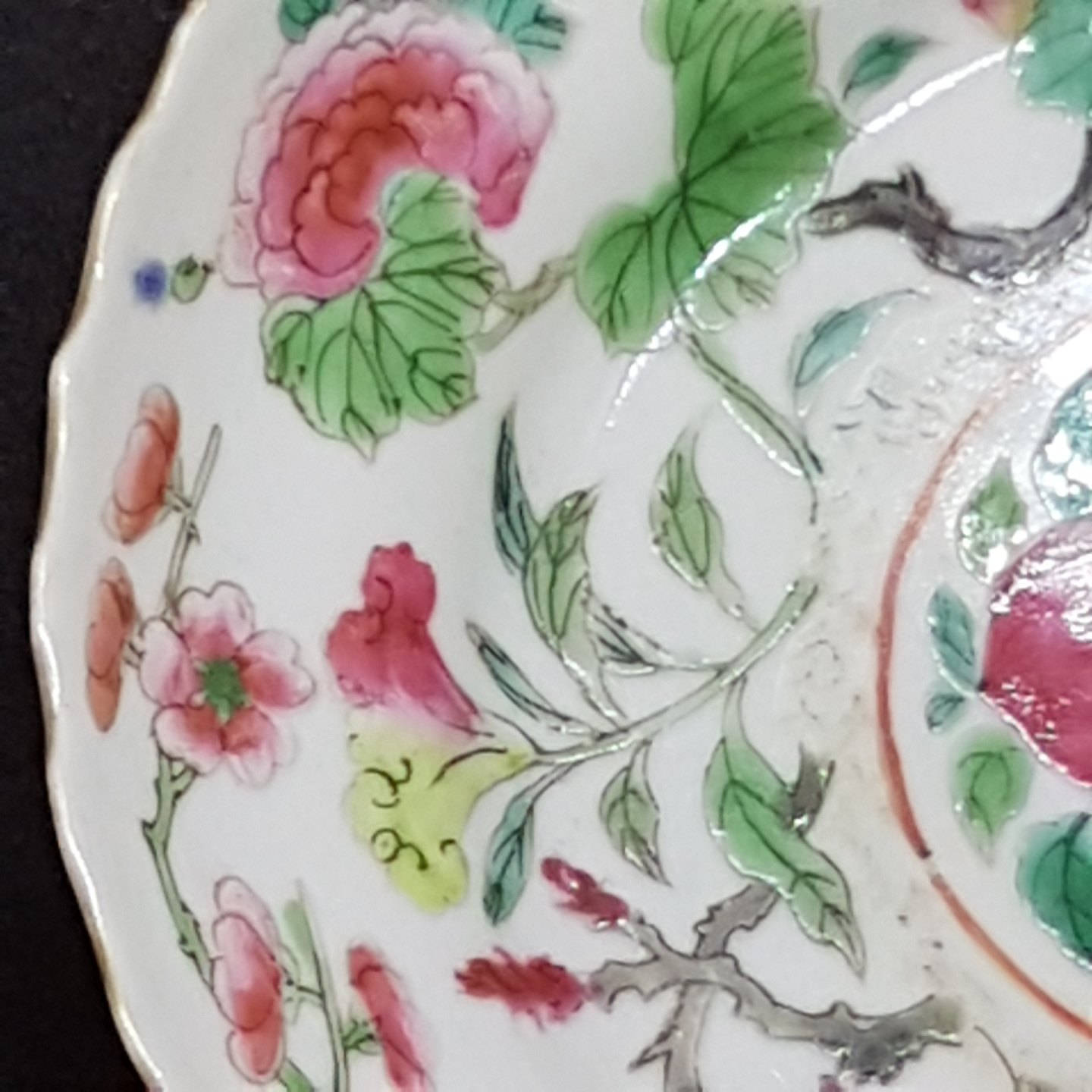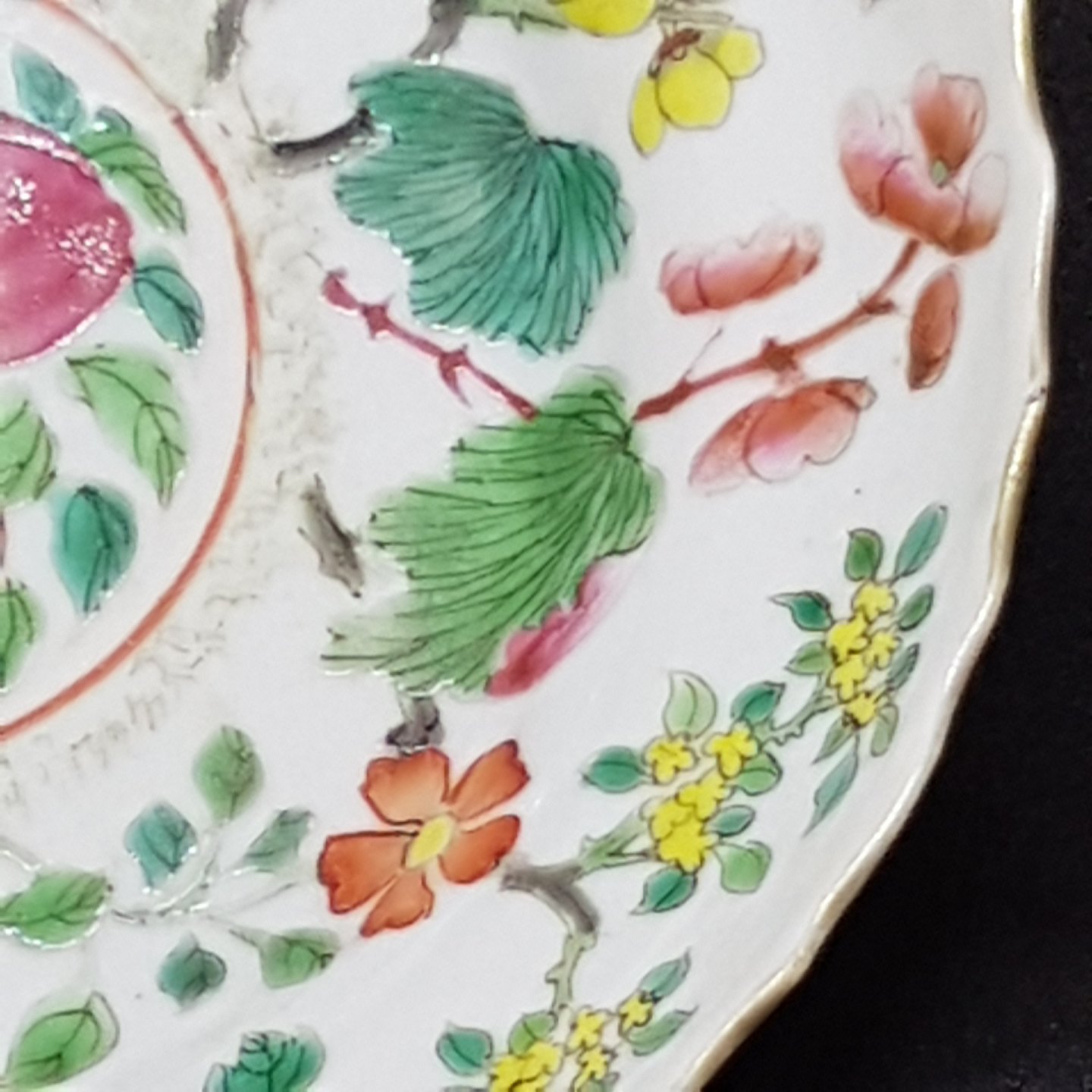 Chinese porcelain plate with scalloped edge. Daoguang period and mark (1820-1850). Center with bat and peaches, around the center a variety of blossoming flowers and their leaves. The scalloped edge is gold painted and has a small burning flaw. Back with red period mark and bats. Diameter 13.5 cm.