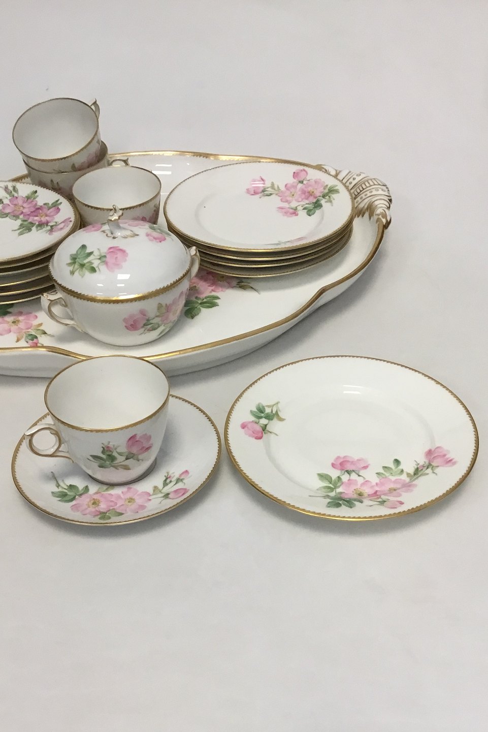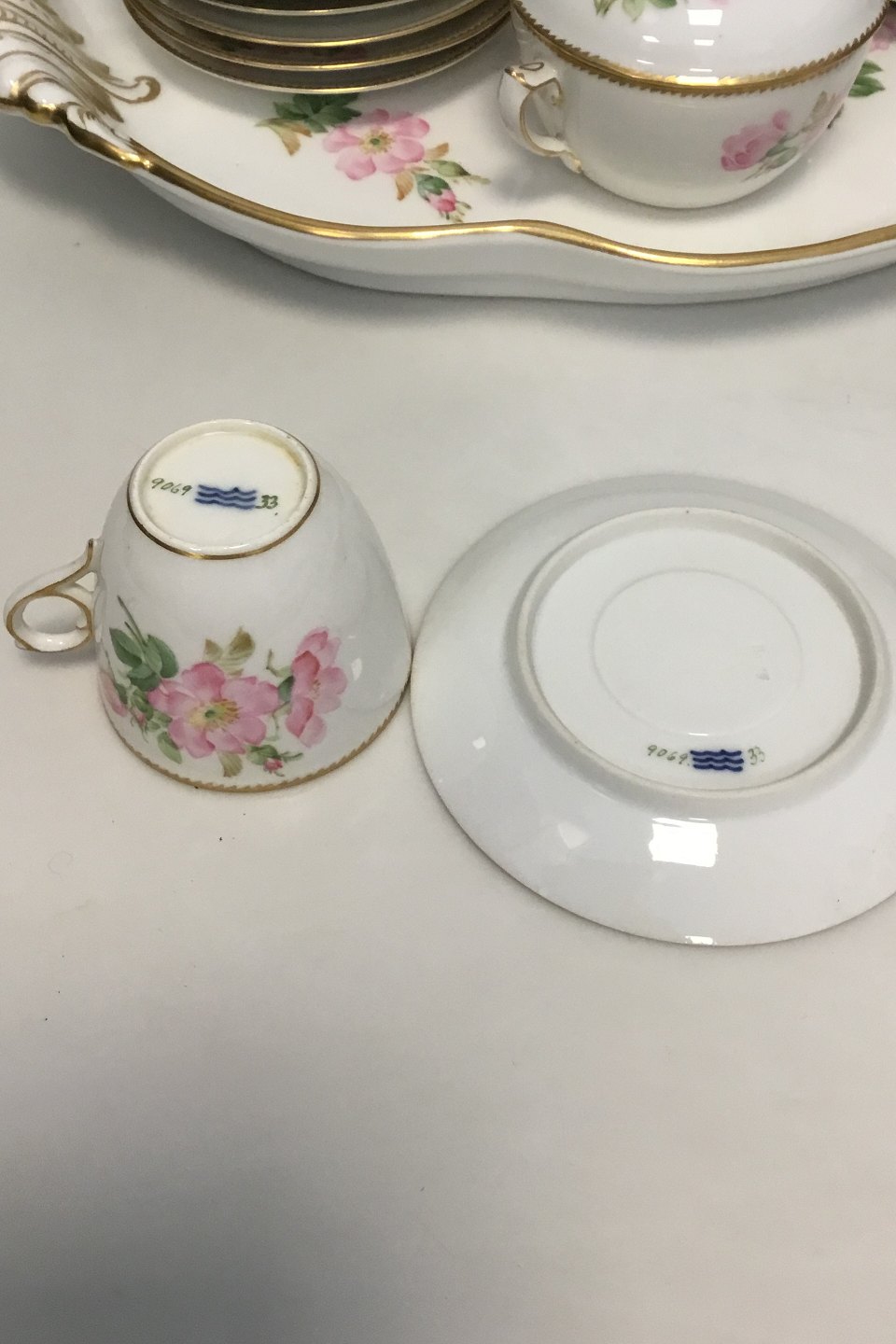 Royal Copenhagen Tete a Tete service decorated with Wild Rose and gold. Consists of a Tray, a sugar Bowl, 4 Coffee cups and 5 Cake Plates