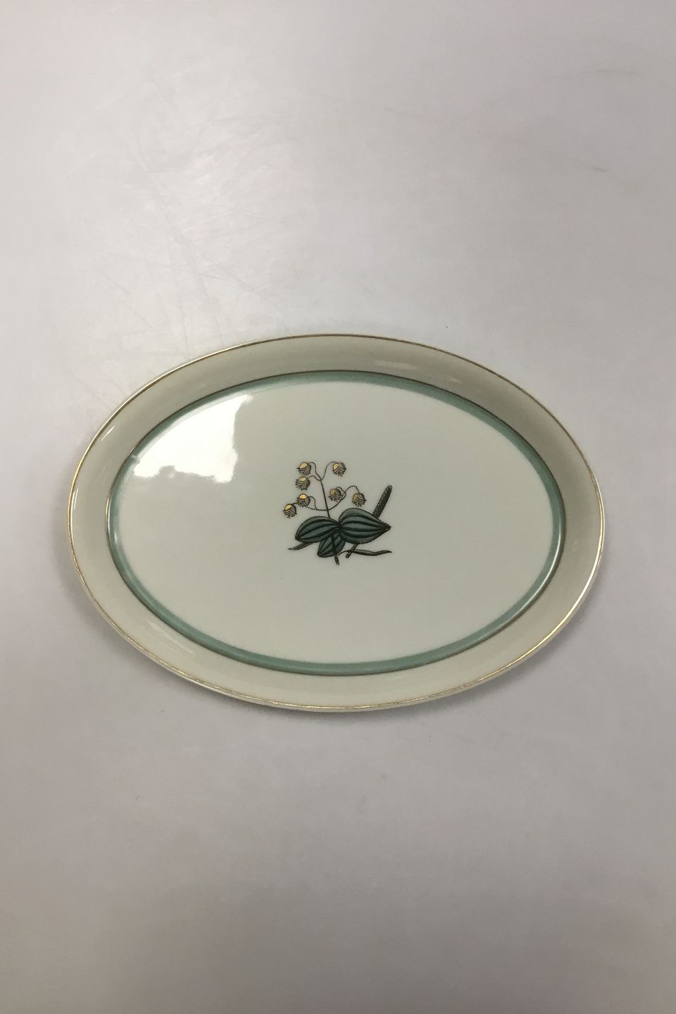 Royal Copenhagen Quaking Grass Oval Tray No 884/9405. Measures 25.5 cm / 10 3/64 in. x 18.5 cm / 7 9/32 in. Slight wear on gold edge.