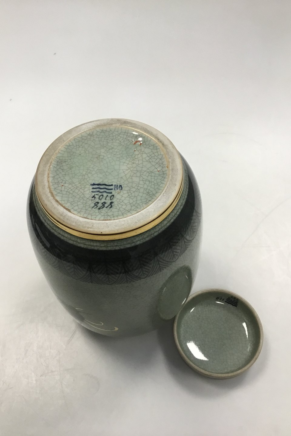 Royal Copenhagen Green Cracle Glaze Lidded Vase/Urn with Flower decoration with Gold No 5010/888 . Measures 23,5 cm / 9 1/4 in.