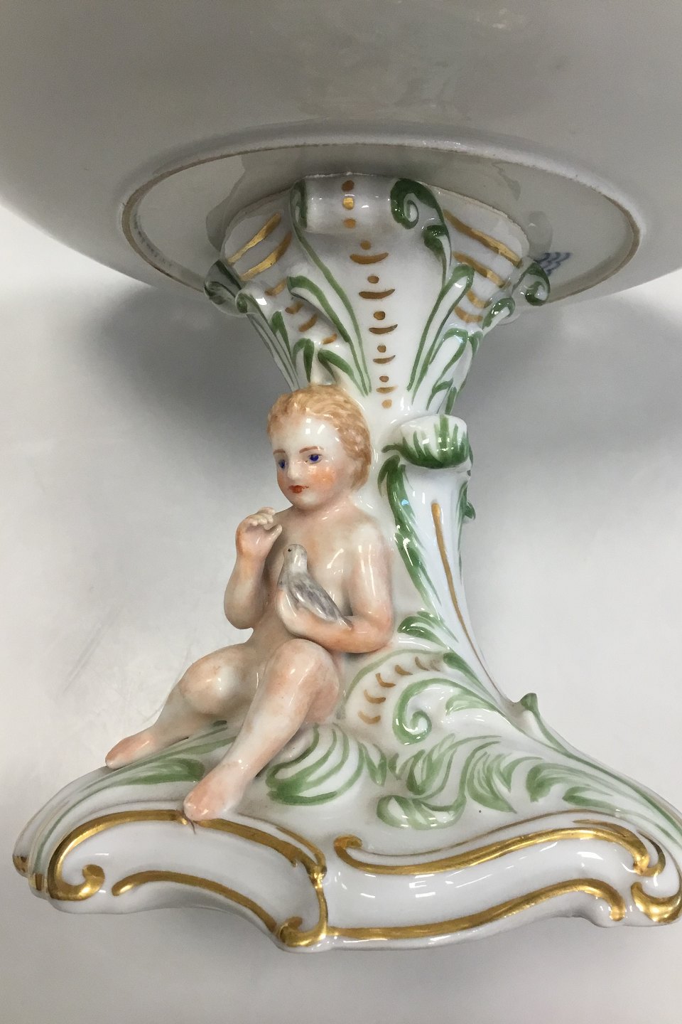 Royal Copenhagen Flora Danica Pedistal Bowl with flowerdecoration and Putti with dove. Measures 15.5 cm / 6 7/64 in. high and 20.5cm / 8 5/64 in. dia