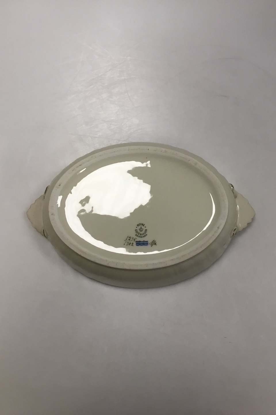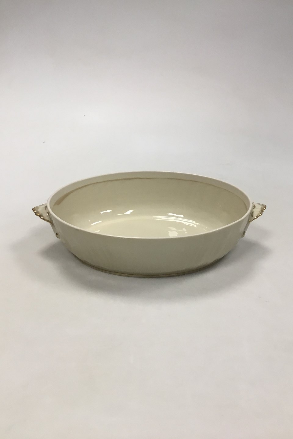 Royal Copenhagen Creme Curved with Gold (Pattern 1235) Bowl No 1702. Without lid. Measures 27 cm / 10 5/8 in x 19 cm / 7 31/64 in x 7 cm / 2 3/4 in.