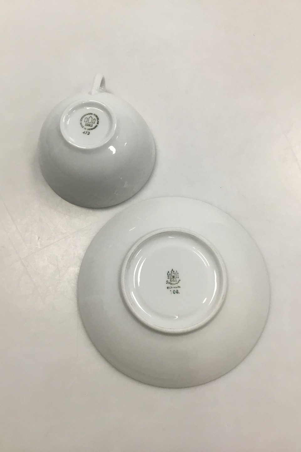 Bing & Grondahl Elegance, White Tea Cup and Saucer No 473. Measures Cup: 4.8 cm / 1 57/64 in. x 10.5 cm / 4 9/64 in. Saucer: 15.5 cm / 6 7/64 in.