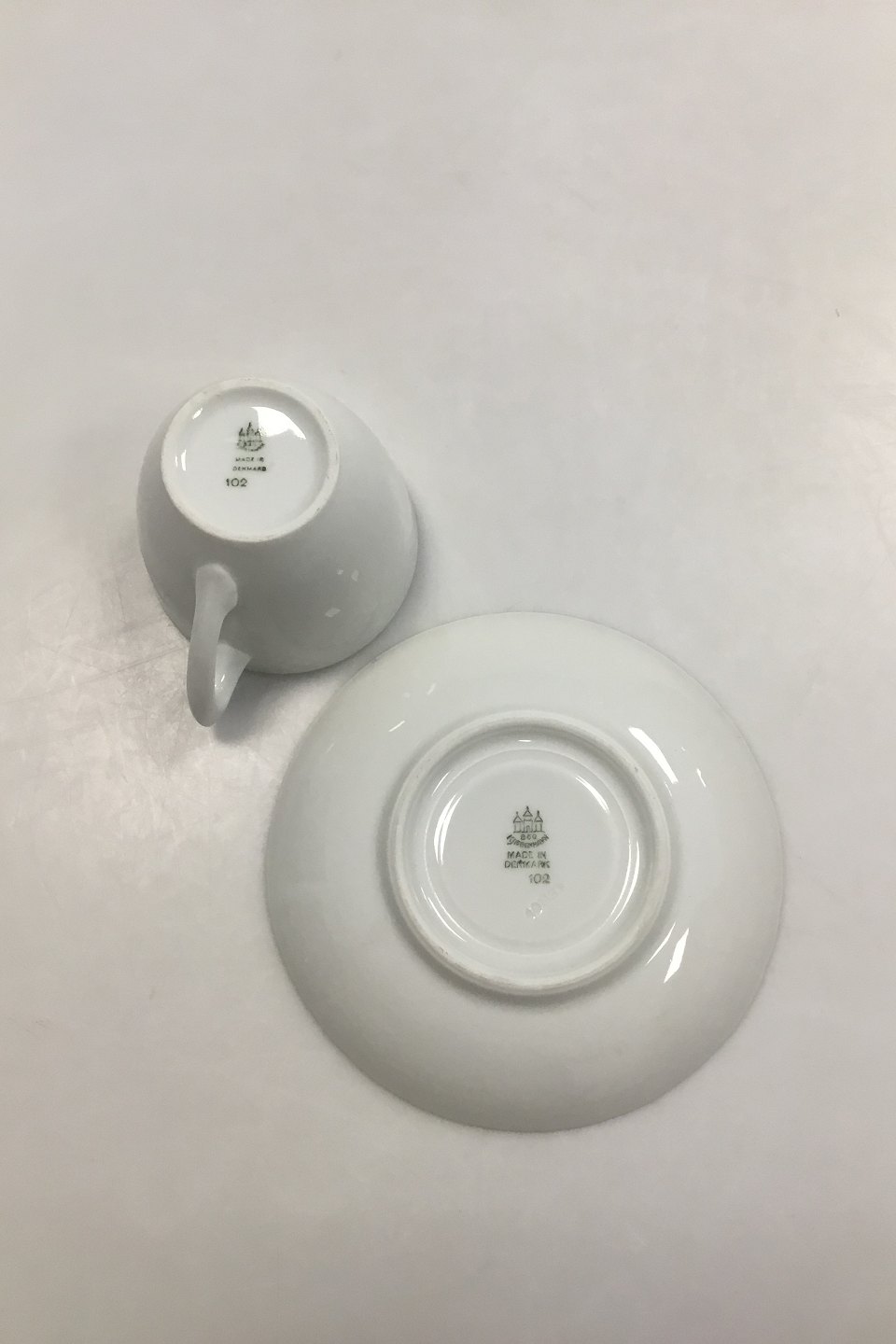 Bing & Grondahl Elegance, White Coffee Cup and Saucer No 102. Measures Cup: 6 cm / 2 23/64 in. x 7.5 cm / 2 61/64 in. Saucer: 13.4 cm / 5 9/32 in.