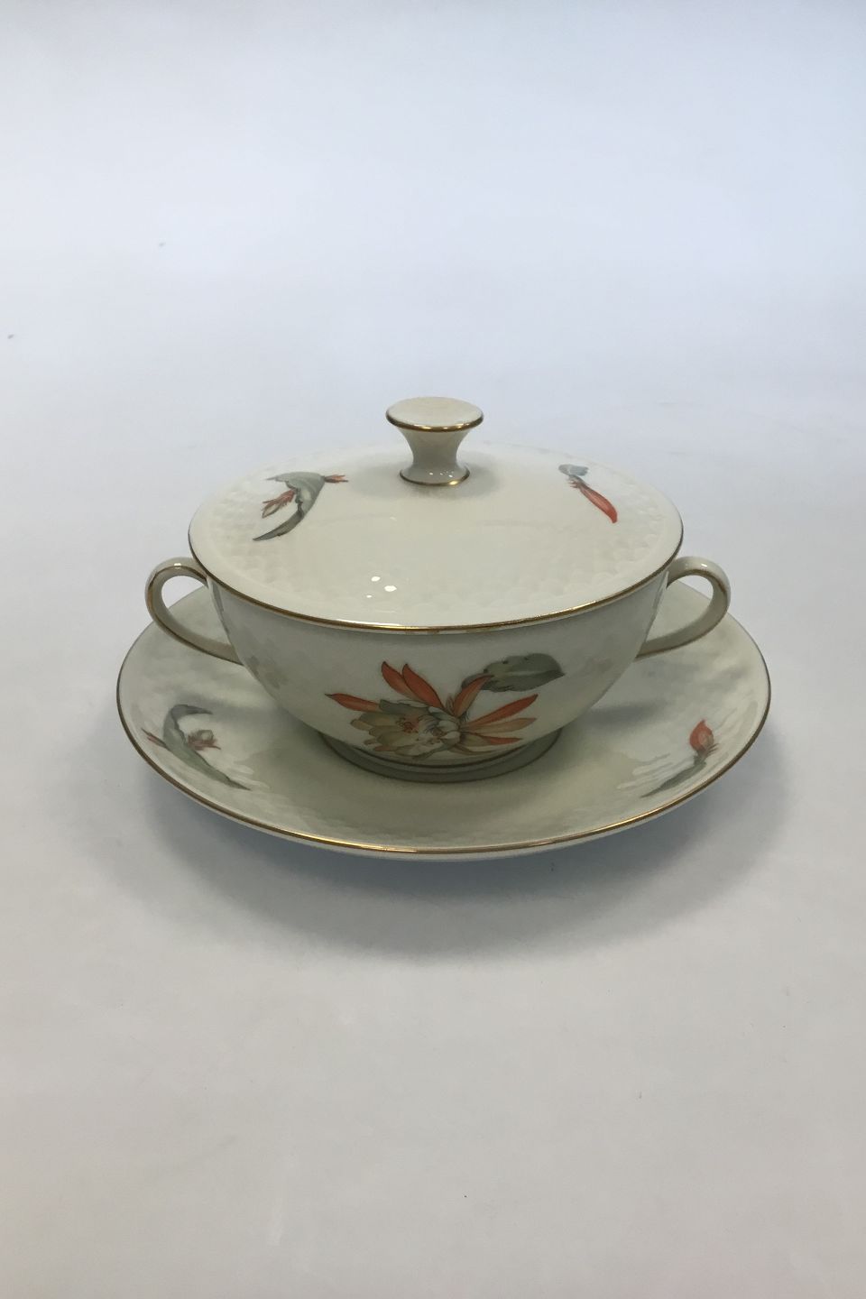 Bing & Grondahl Cactus Bouillon Cup with Lid and Saucer No 481 and 247. Measures Cup: 8.5 cm / 3 11/32 in. x 12.5 cm / 4 59/64 in. dia. Saucer: 17.5 cm / 6 57/64 in.