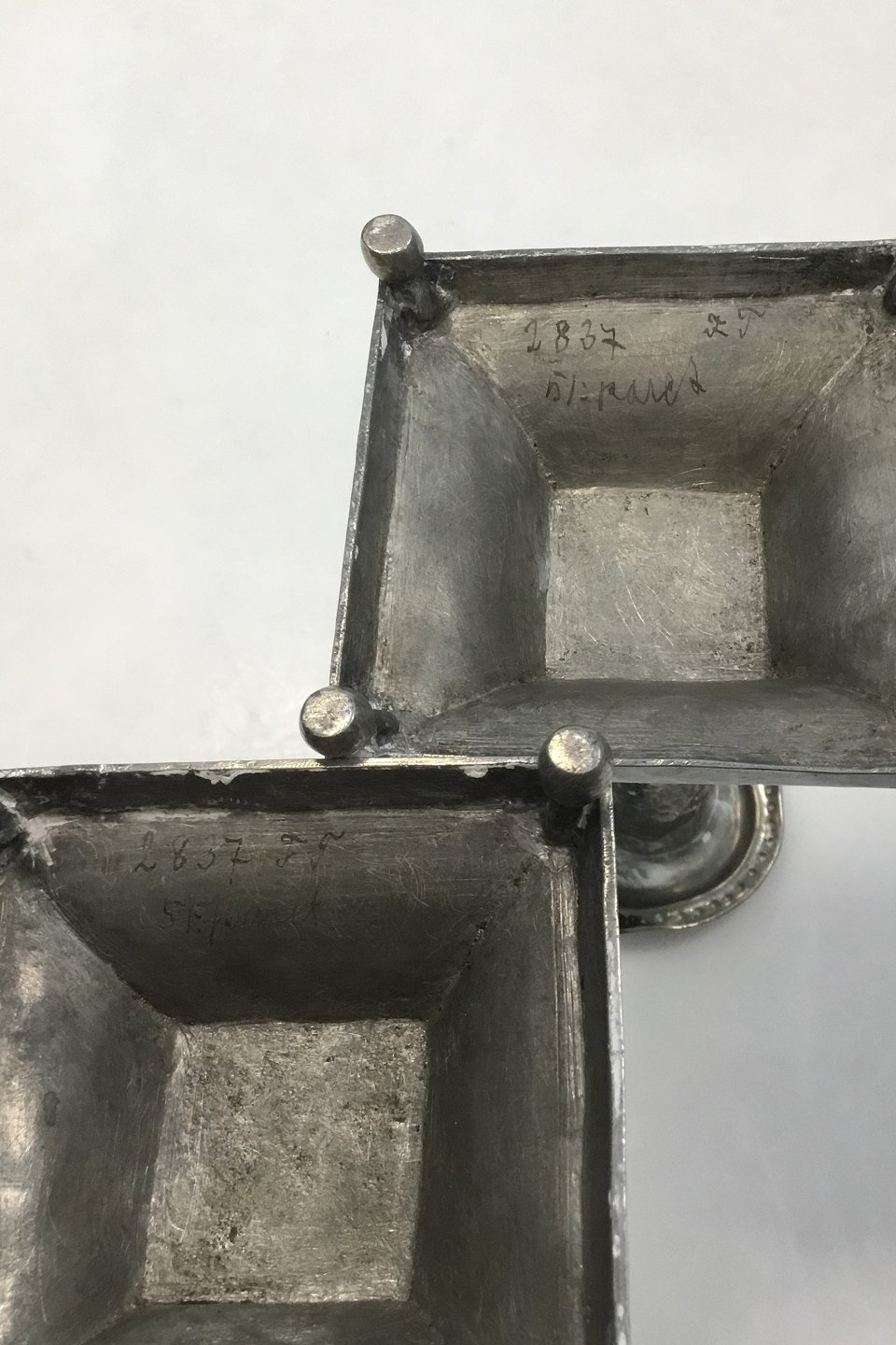 A Pair of hammered candlelight holders made of Pewter. With skews at the top. Square base. Measures 11.5 cm / 4 17/32 in.
