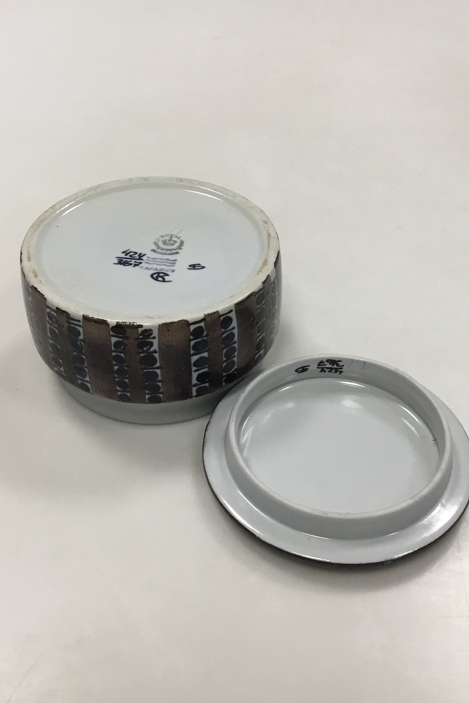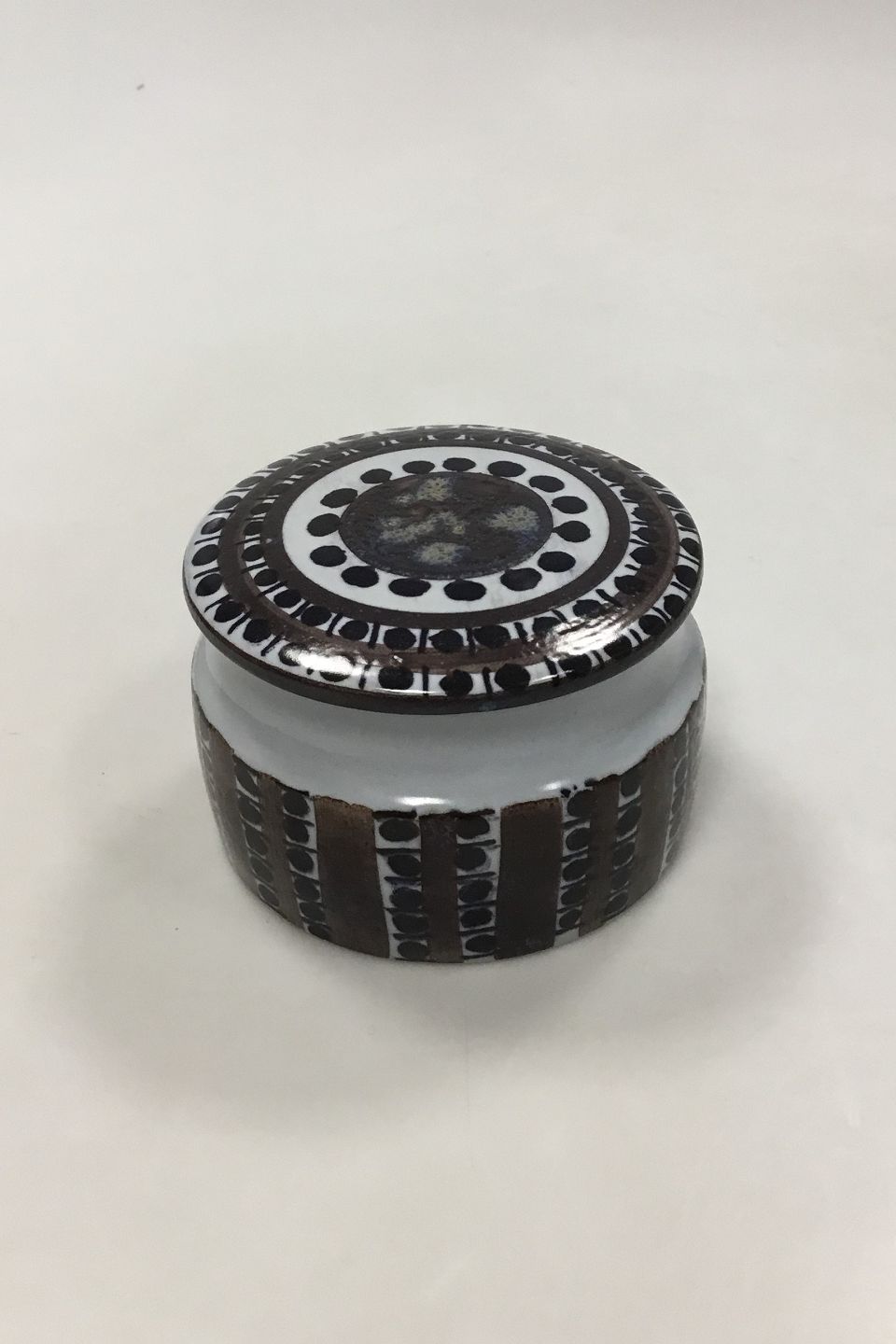 Royal Copenhagen Faience Bonbonniere No 424/3167. Designed by Kari Christensen.. Measures 6 cm x 10 cm dia. / 2 23/64 in. x 3 15/16 in. dia.