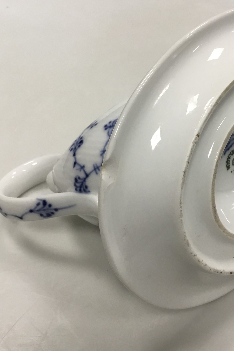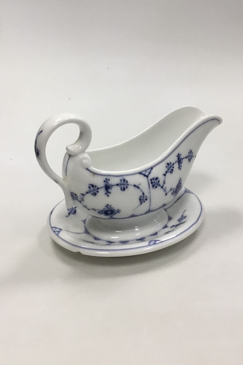 Royal Copenhagen Blue Fluted Plain Saucebowl with handle and saucer No 200. Measures 20 cm x 14 cm / 7 7/8 in. x 5 33/64 in.