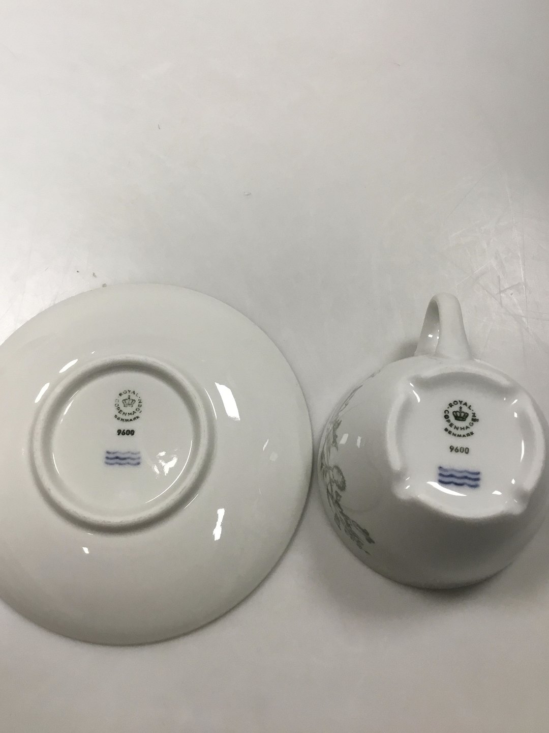 Royal Copenhagen Hotel Porcelain decorated with wild herbs Coffee Cup and Saucer No 9600. Measures Cup: 6 cm x 6,5 cm dia. Saucer: 14,3 cm ( Cup: 2.36 in. x 2.56 in. dia. Saucer: 5.63 in. )