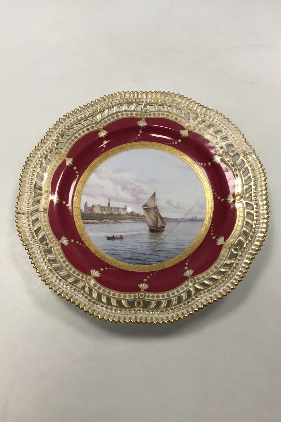 Royal Copenhagen Flora Danica Pattern Plate decorated with motif with ships and Kronborg. Measures 24.5 cm / 9.65 in. With repairs