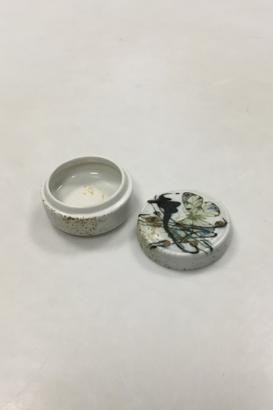 Royal Copenhagen Stoneware Small Box No 1055/5325. Designed by Nils Thorsson, decorated with Butterfly. Measures 6 cm / 2.36 in.