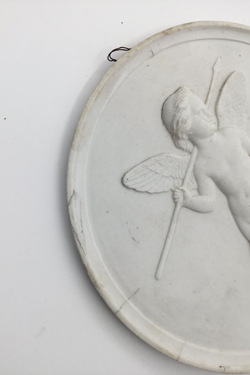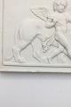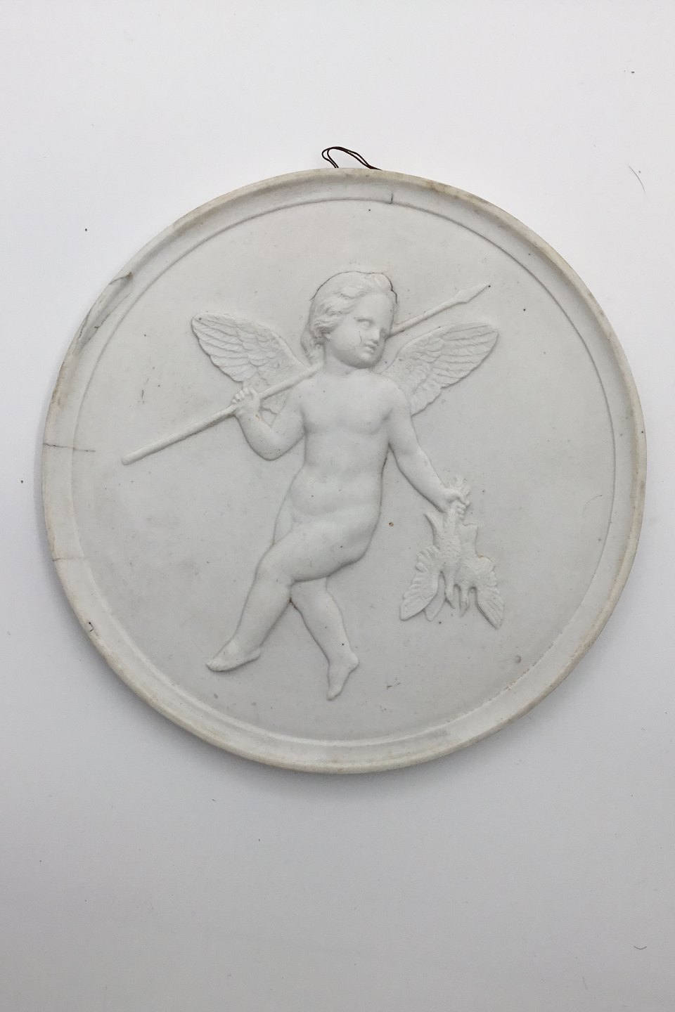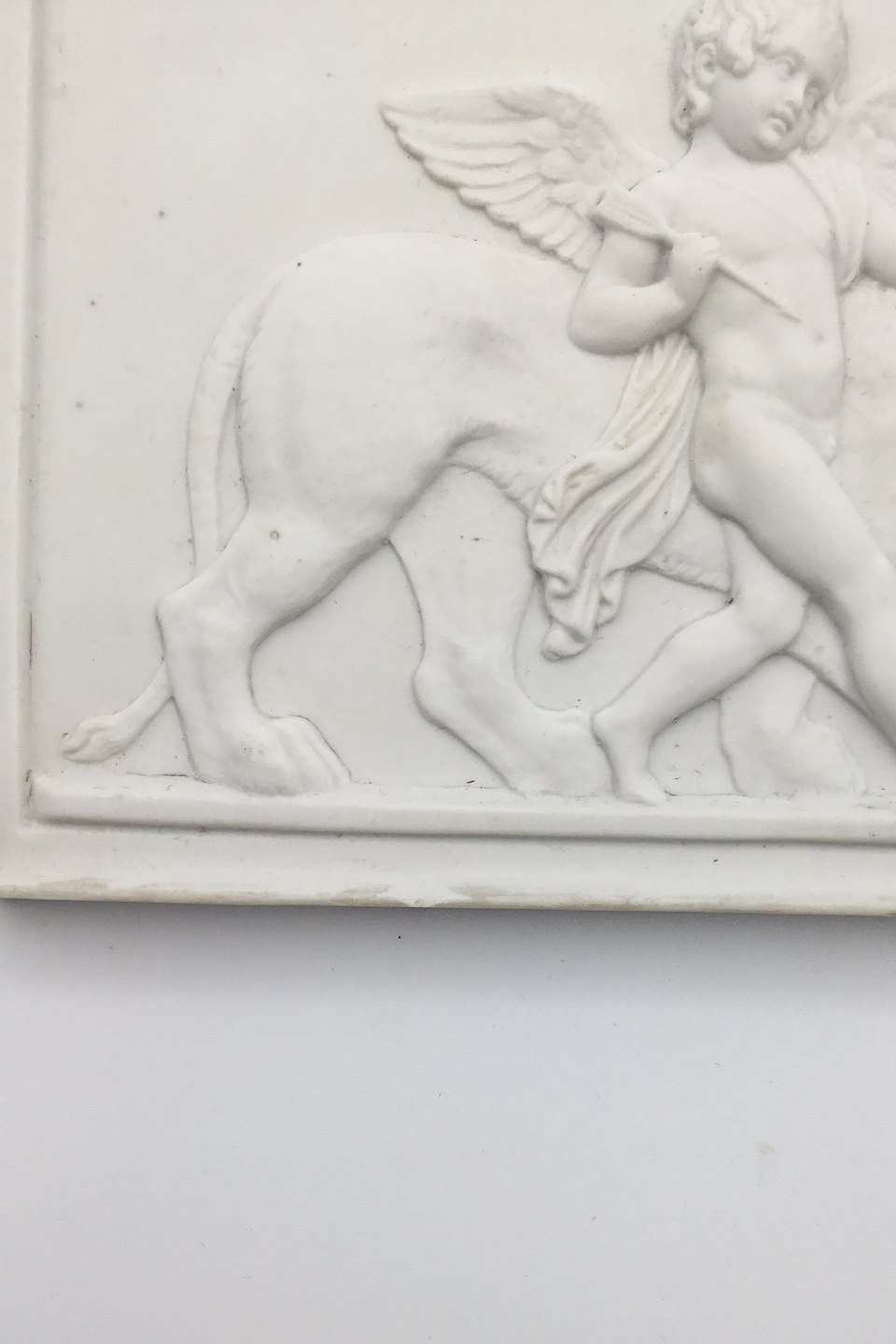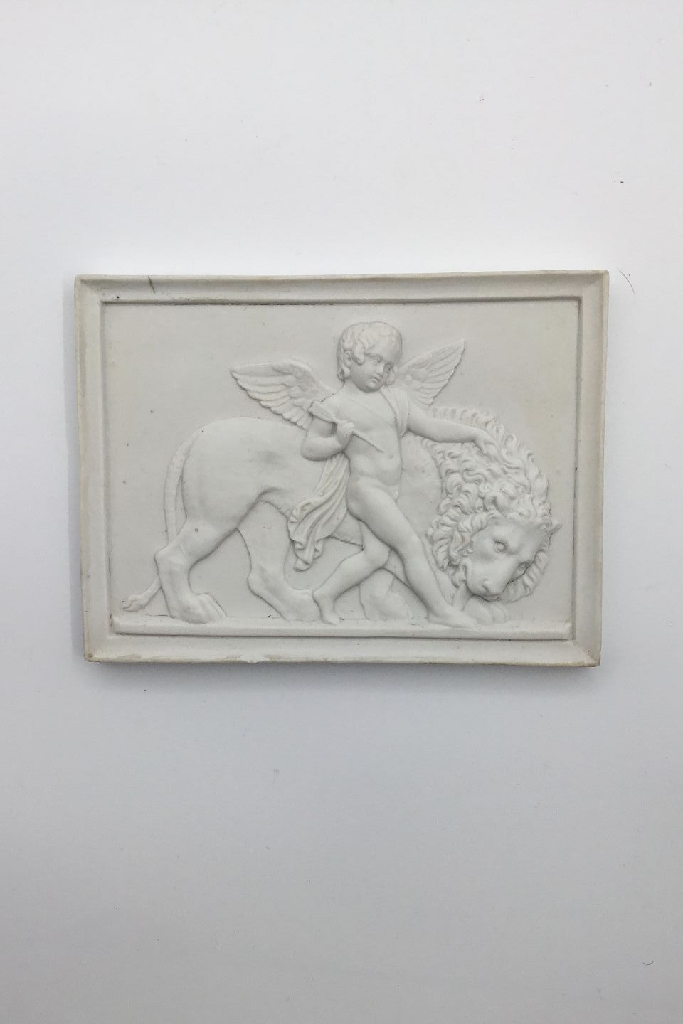 Bing og Grondahl bisque plate by Bertel Thorvaldsen: Amor with the tame Lion. Copy after the original made in Rome 1828. Measures: 10 x 13,5cm (3.93 x 5.31 inches).