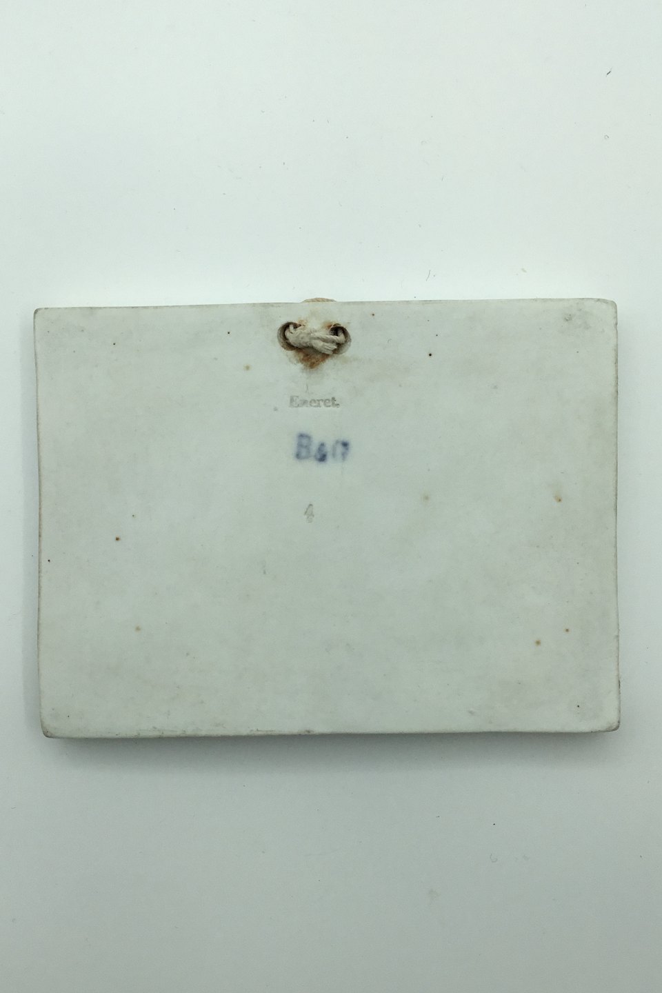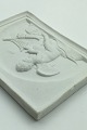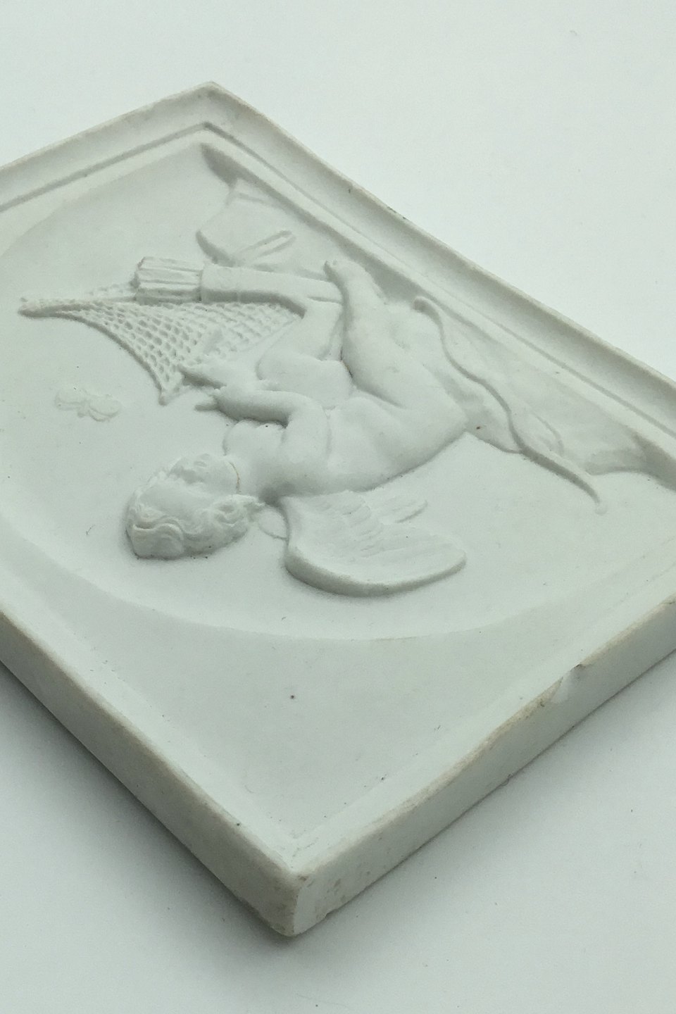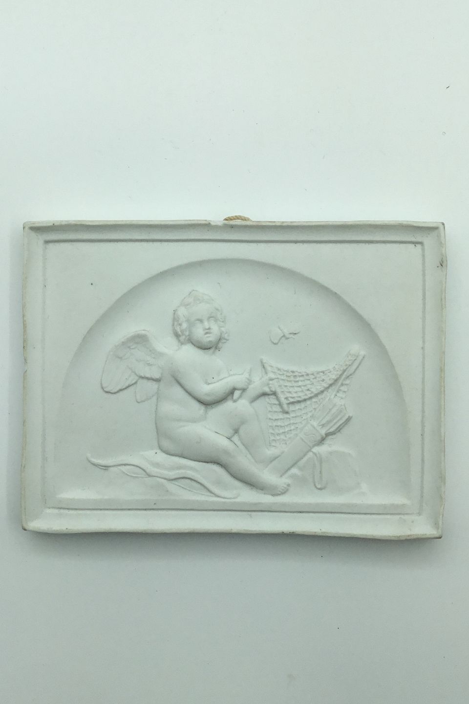 Bertel Thorvaldsen: Royal Copenhagen Kgl. Porcelain Biscuit Plate "Cupid Works a Net" No 82. Copy from 1852 after Thorvaldsen's original from Rome 1831. Measures 13.5 x 9.5 cm (5.31 x 3.74 inches). Two chip. One in the middle of the top and one on the edge to the left.