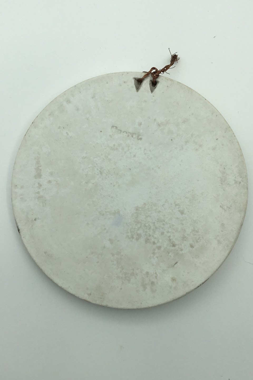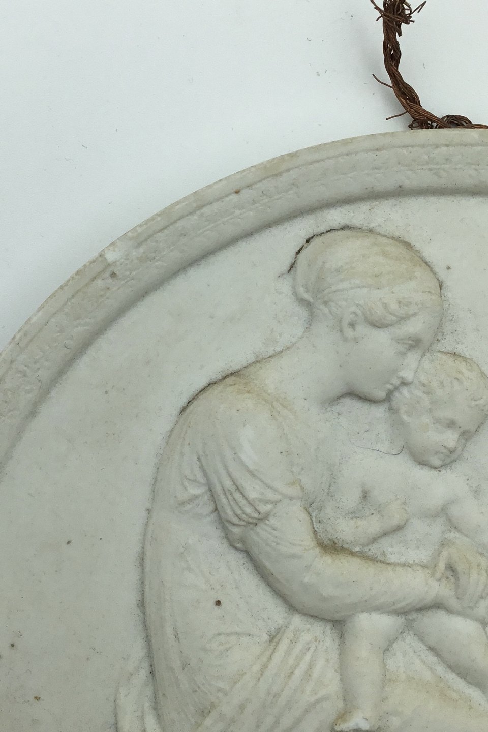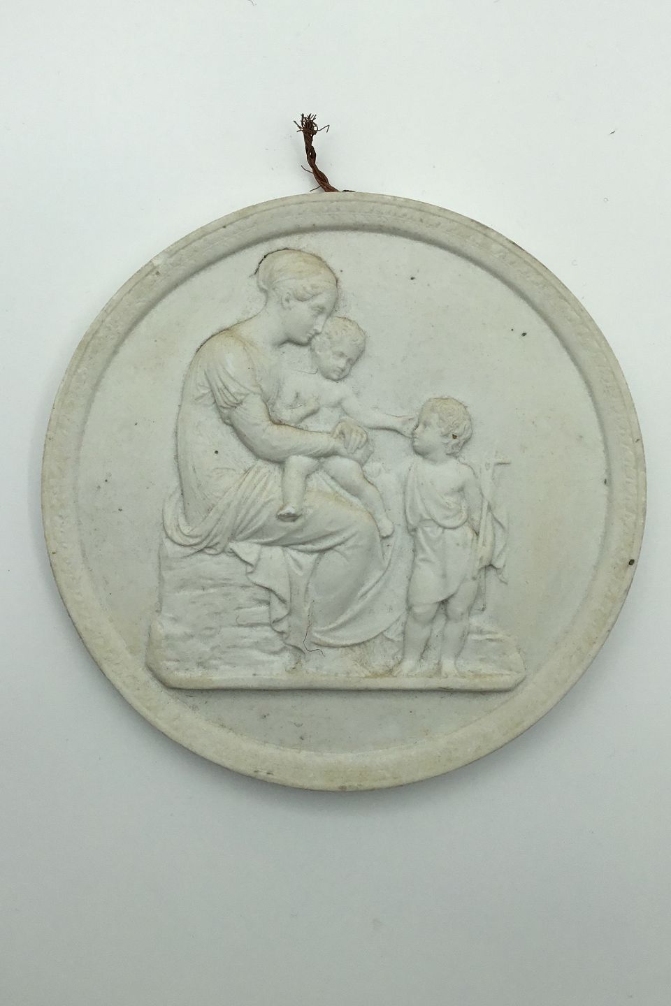 Royal Copenhagen Bisque Plate "Maria with Jesus and Johannes" No 120. Copy from 1841 after Thorvaldsen relief in Rom 1806. Measures 13,5cm (5.31 inch). Small chip to left, behind Maria“s neck.