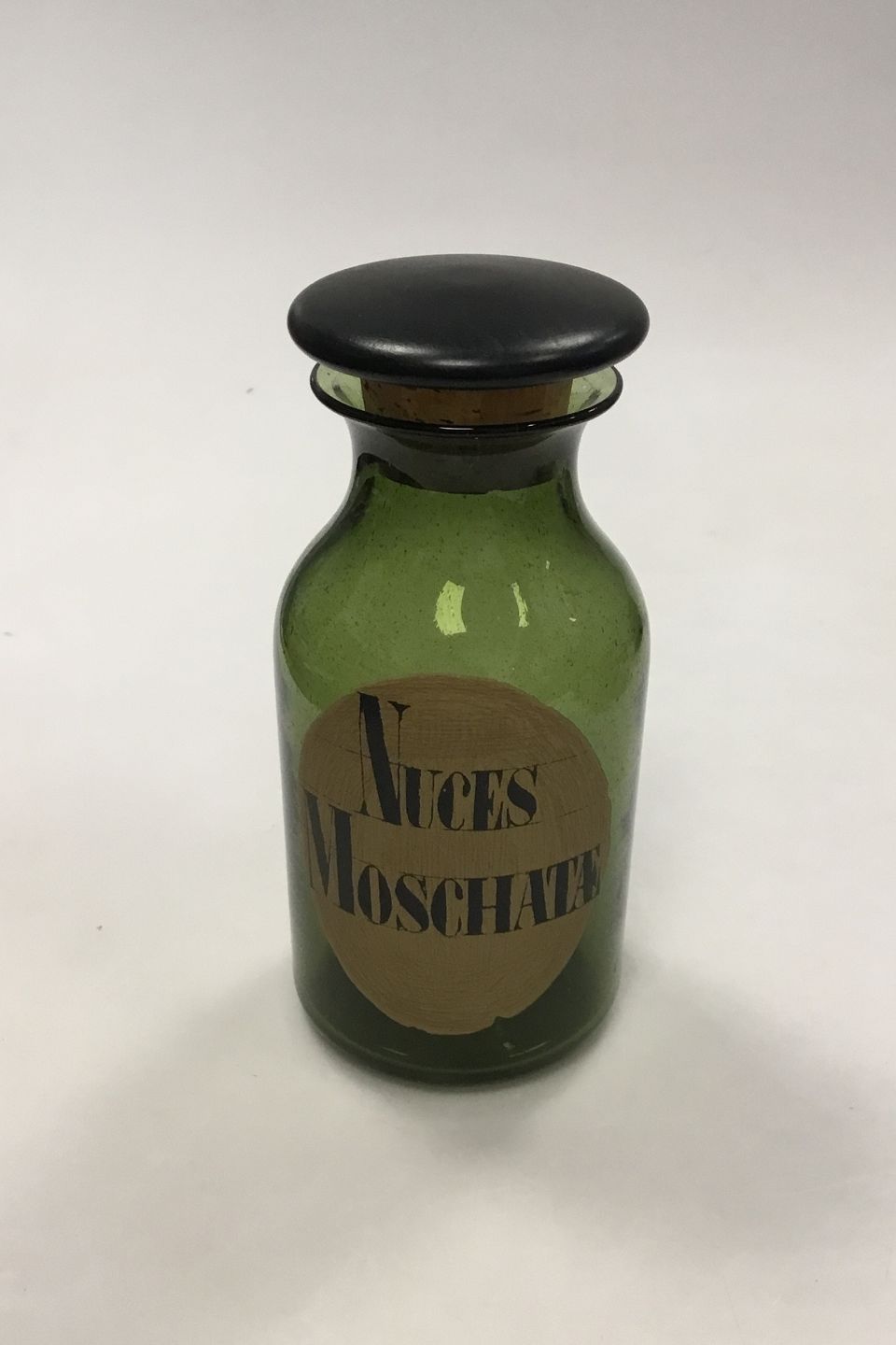 Holmegaard Pharmacy Jar with the text Nuces Moschatę from 1985.