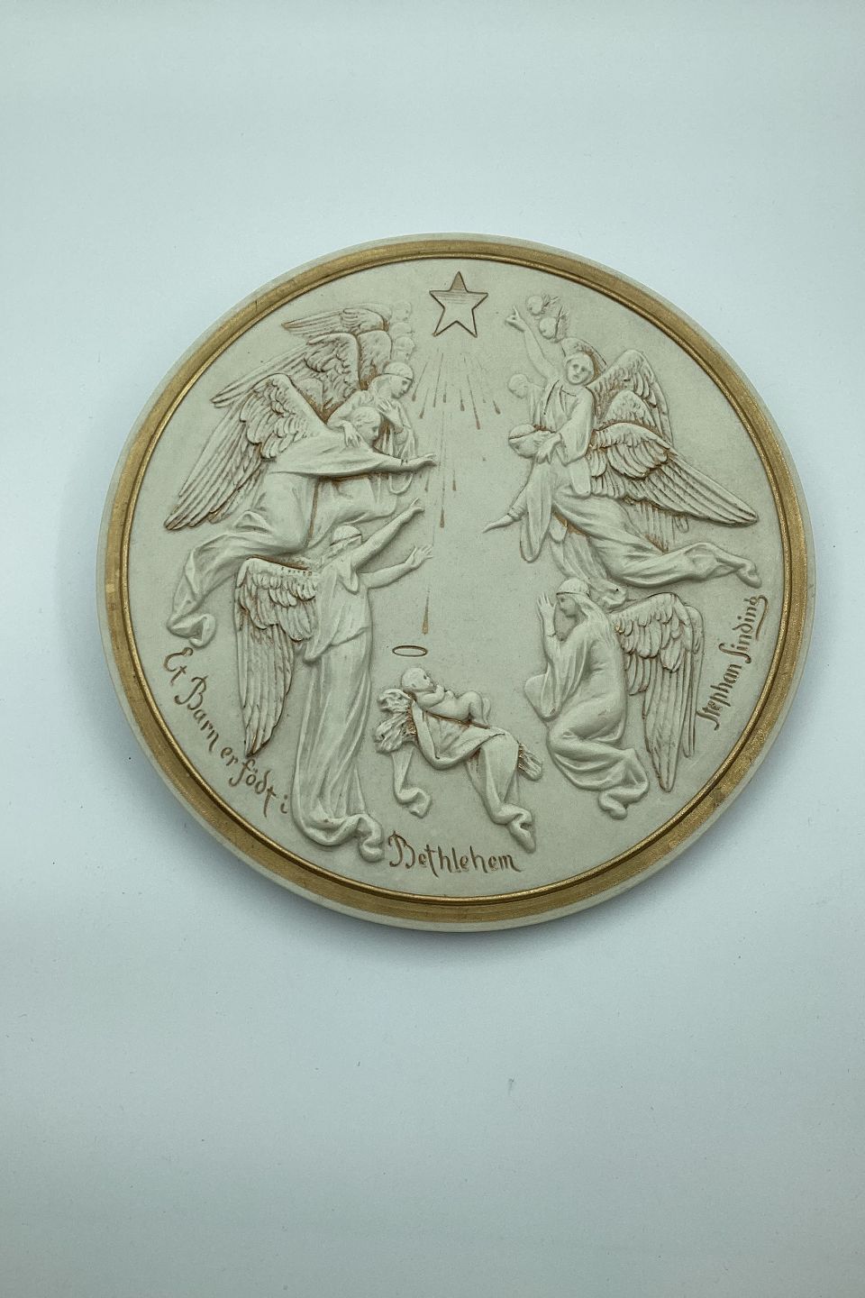 Stephen Sinding: Bing and Grondahl bisquit plates "A Child is born in Bethlehem". Made late 19th. century. In good condition. Partly gold staffings on the decoration and in the text. Measures 24 cm in diameter (9.44 inches)