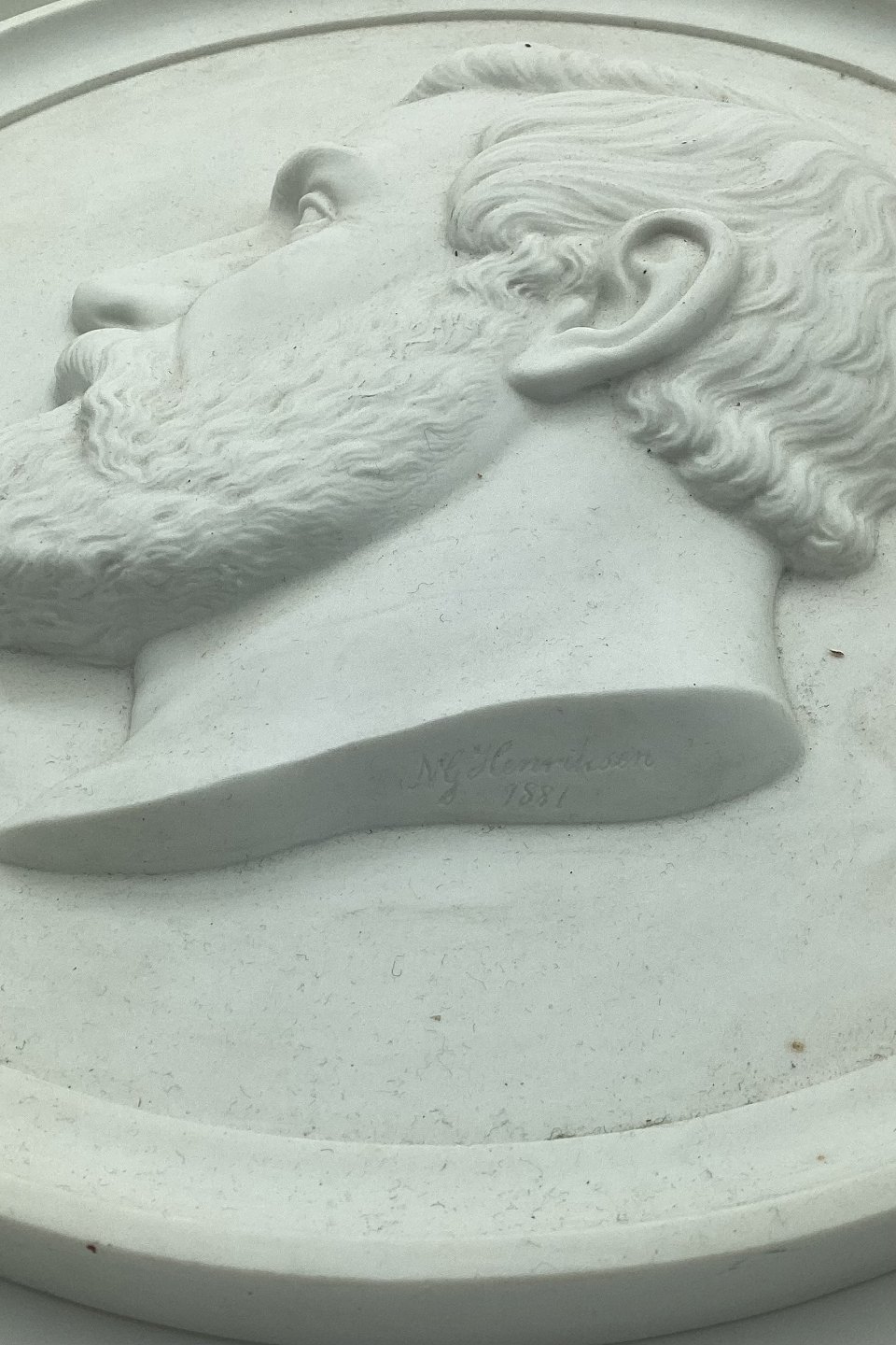 Pair of Royal Copenhagen portrait plates in bisquit by Niels Georg Henriksen. Unknown couple. In the period around the production, N. G. Henriksen retrieved motifs from the archives at Thorvaldsen's museum for the production of these plates. Both appear in good condition. Both plates are signed by the artist on the neck together with production year 1884. Measures 25 cm in diameter (9.84 inches)