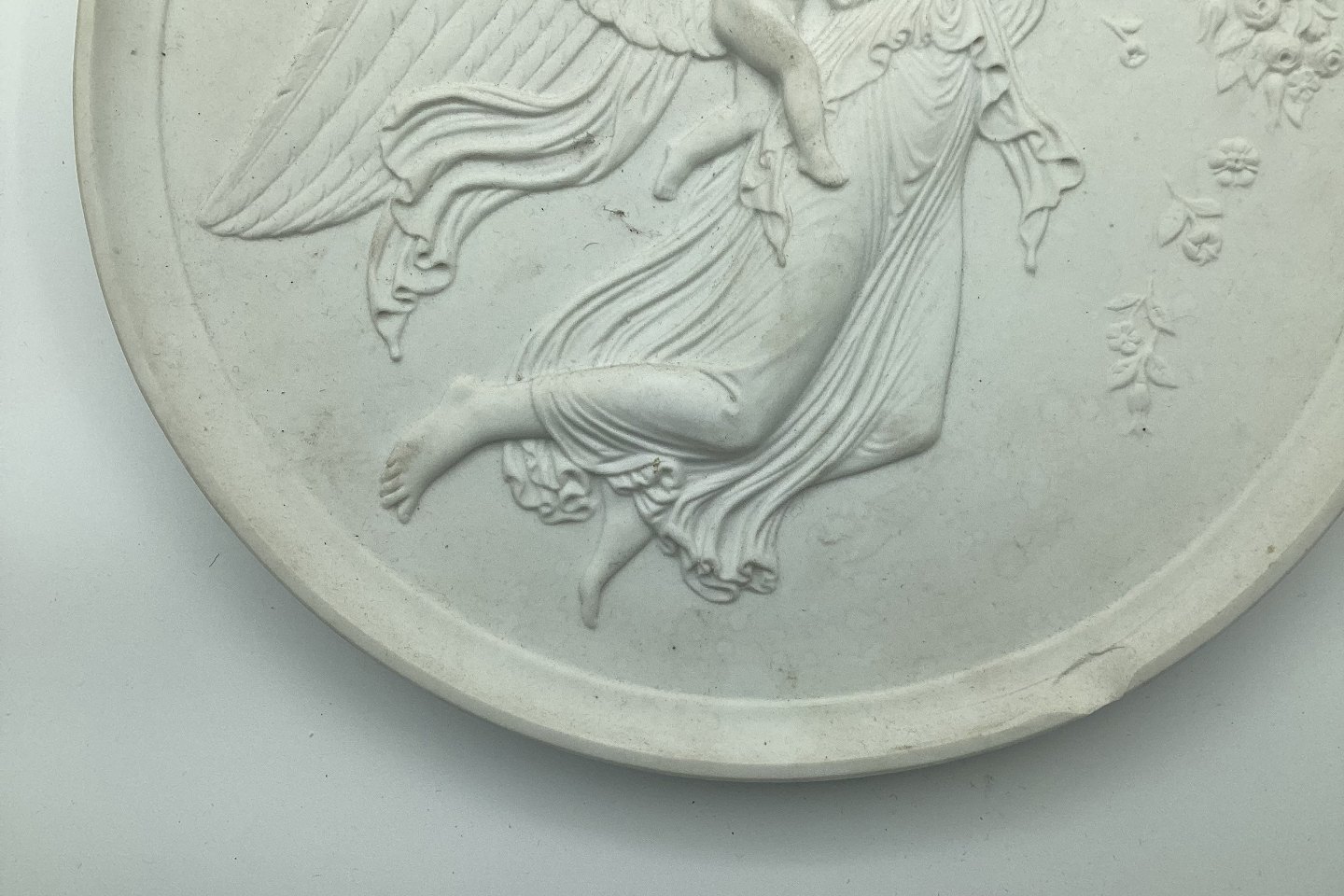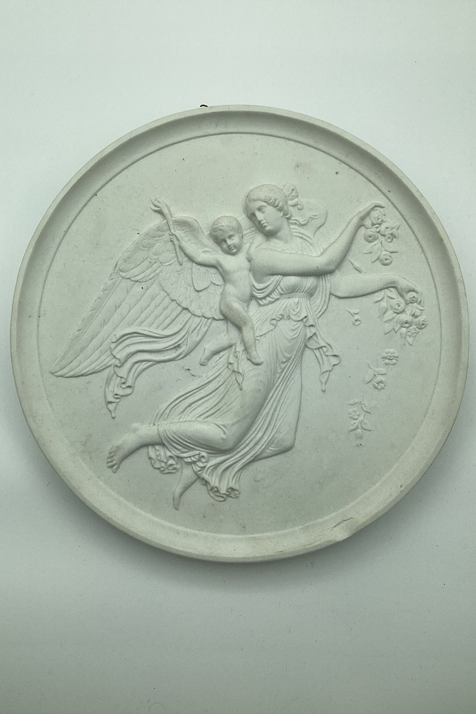 Bertel Thorvaldsen: Royal Copenhagen Biscuit Plate "Dagen". Copy from 1840 after Thorvaldsen's original from Rome 1815. Measures 26cm (10.23 inches). On the edge at the bottom a chip! Made in the late 19th century.
